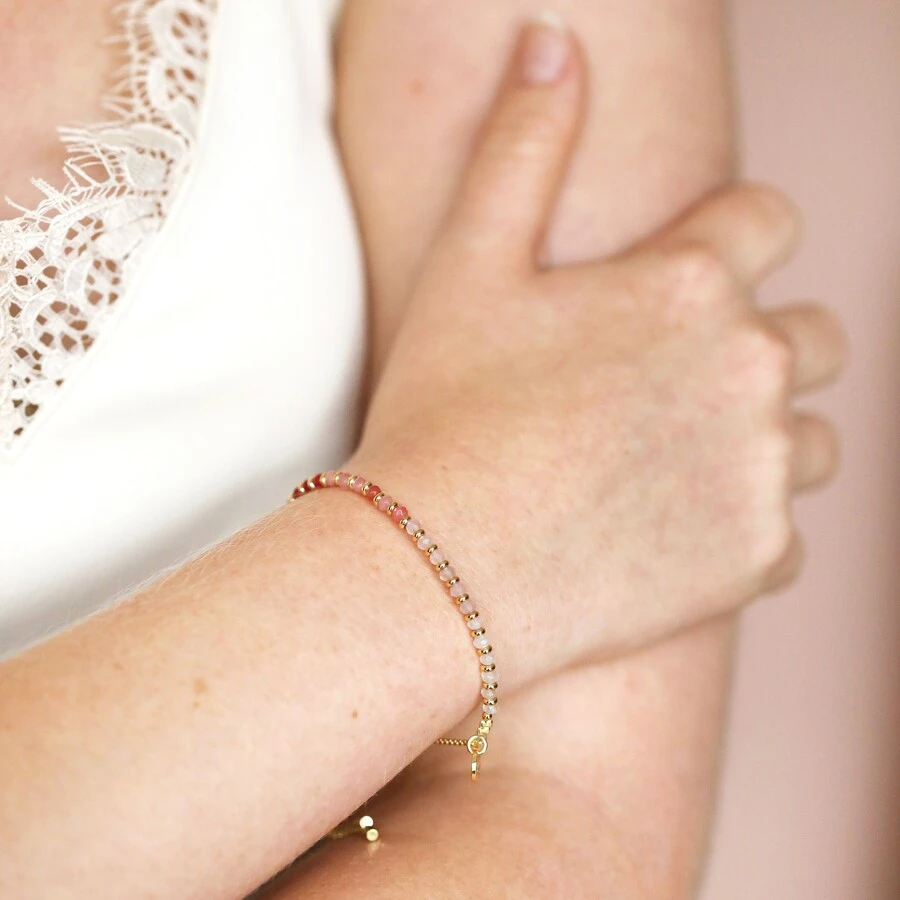 Featuring glass beads in a gradient of beautiful pink tones separated by glossy golden spacer beads, this subtle piece can be styled in a multitude of ways. Whether you choose to stack it with other gold jewellery or wear it alone, this bracelet will elevate your outfit with ease.