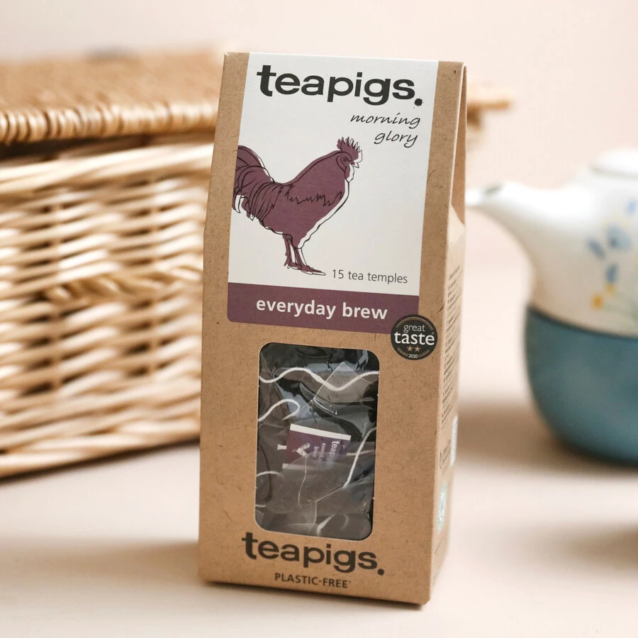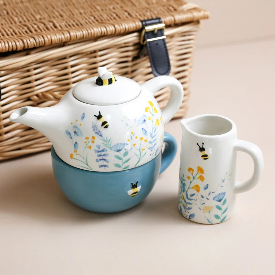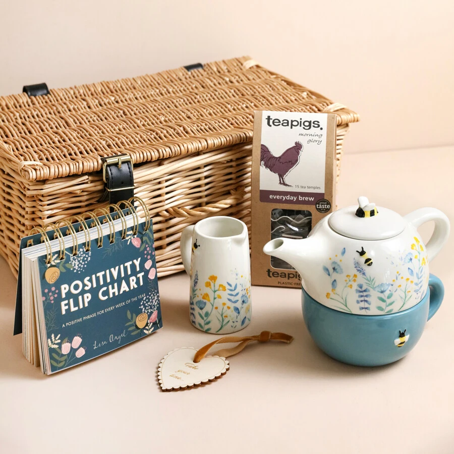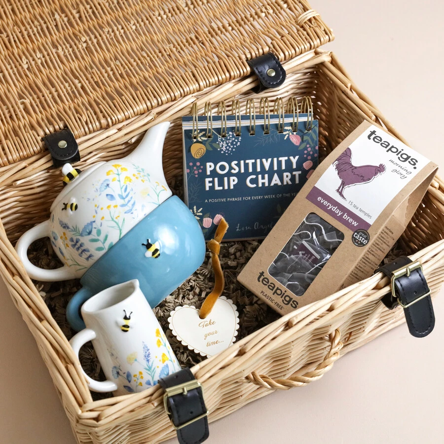 Inside a timeless wicker basket, you will find a sweet, cornflower blue individual teapot and mug set, decorated with little bumblebees and floral details. There is also a small milk jug in a sweet matching pattern for the perfect tea accompaniment. Simply brew the included Everyday Brew tea bags by Teapigs to enjoy a moment of peace.