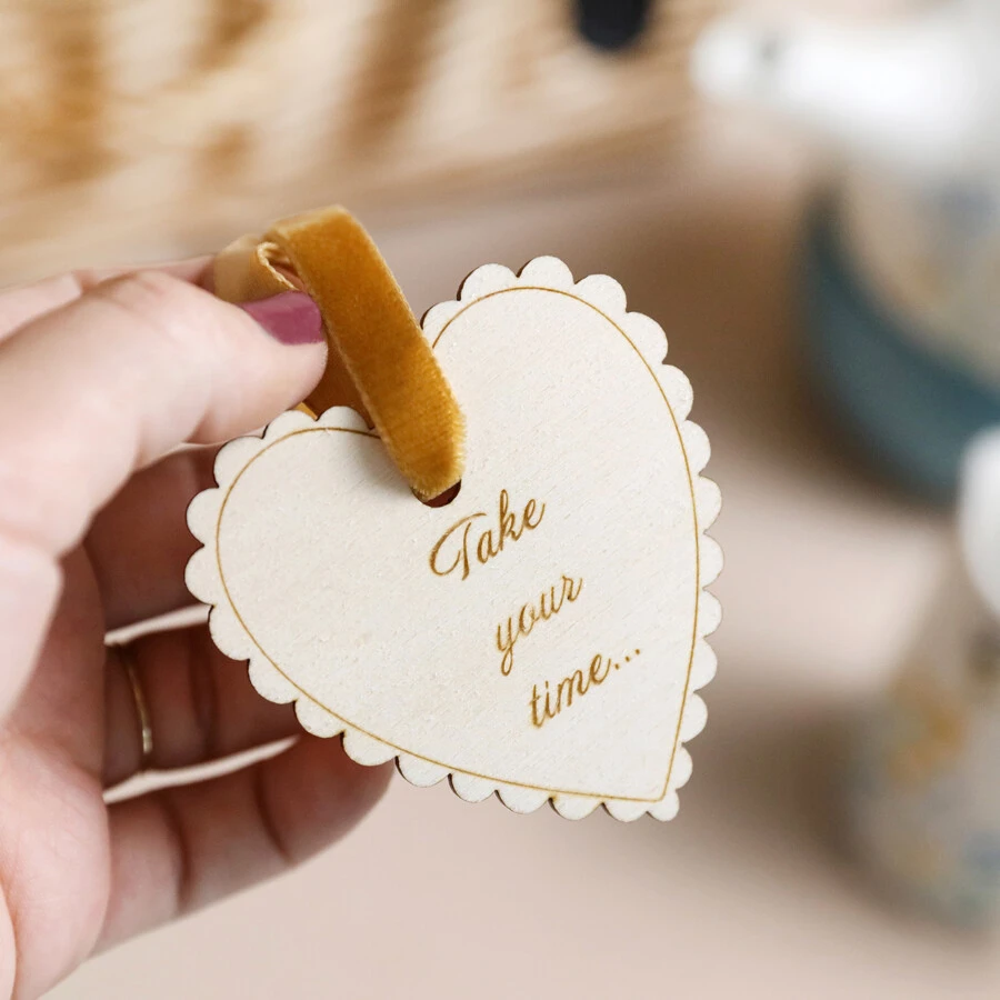 This sweet little hamper is finished off with a wooden heart token that reads ‘take your time’ – the perfect reminder for a friend in need of less stress.