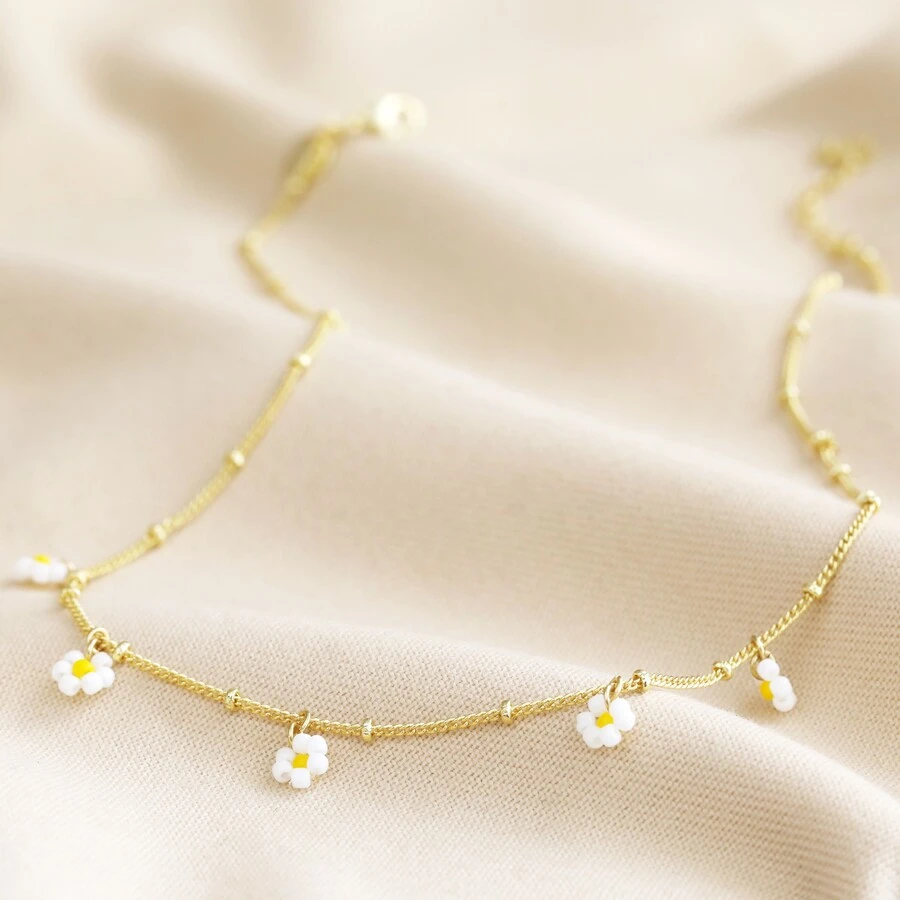 Made from 14ct gold plated brass in a stylish satellite chain style, five pretty daisy charms made up of tiny white and yellow beads are suspended from the front of the chain. The necklace fastens simply via a lobster clasp and can be adjusted to the desired length with the 5cm extender chain.