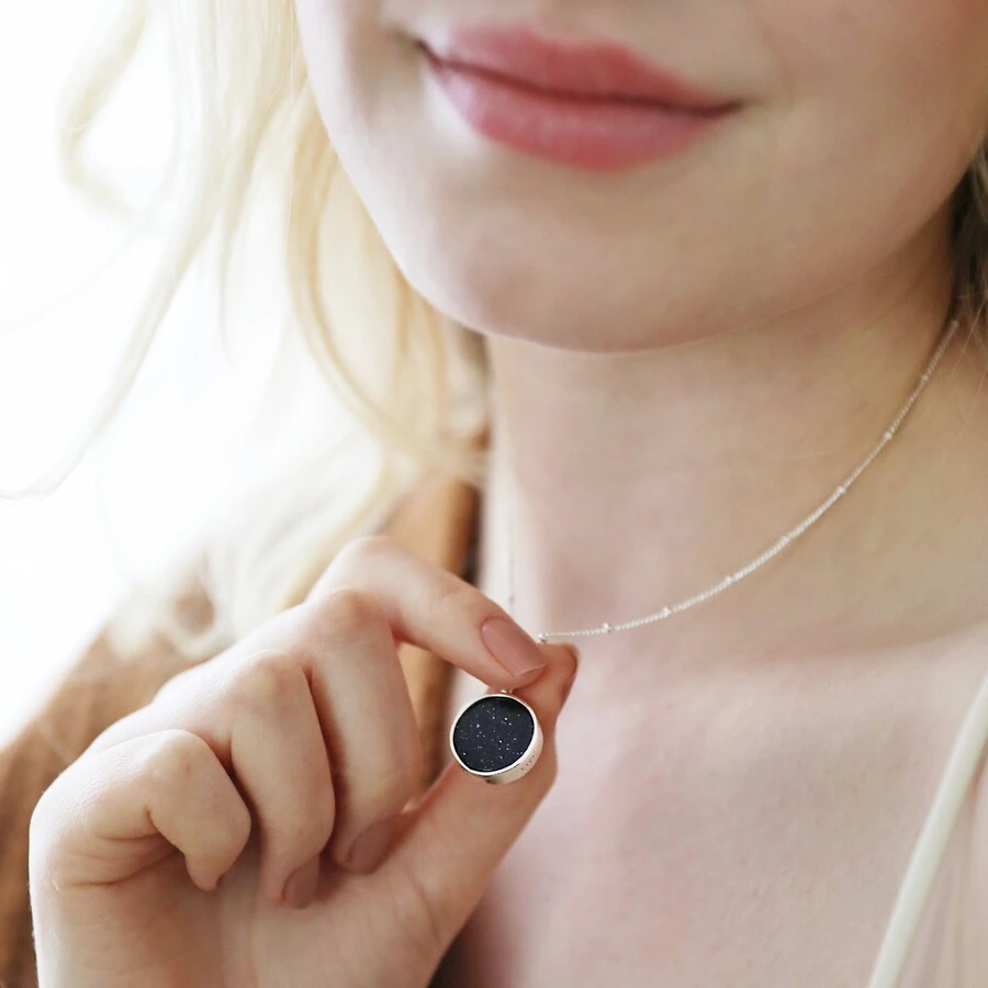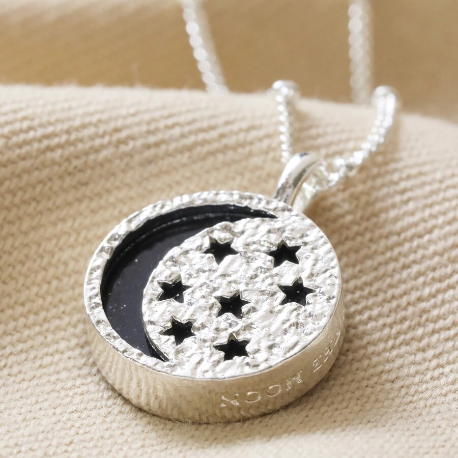 Featuring a thick disc pendant encasing a glitter black semi-precious stone, this gorgeous necklace is a sparkling must-have. The silver plated casing features a textured finish and star and moon cut-outs to reveal the stone beneath, while the back remains open to see the stone in full. To complete the piece, around the outside of the pendant are the words ‘live by the sun’ and ‘love by the moon’ in softly stamped lettering.