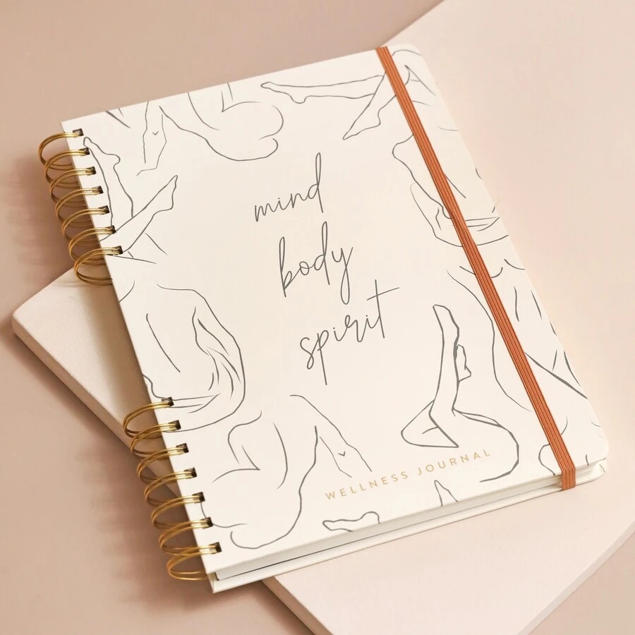 With a cream-coloured cover adorned with line-work illustrations of the feminine form, the middle of the cover has the wording ‘mind body spirit’ in script font. The bottom of the cover is finished with the wording ‘wellness journal’ in gold.
