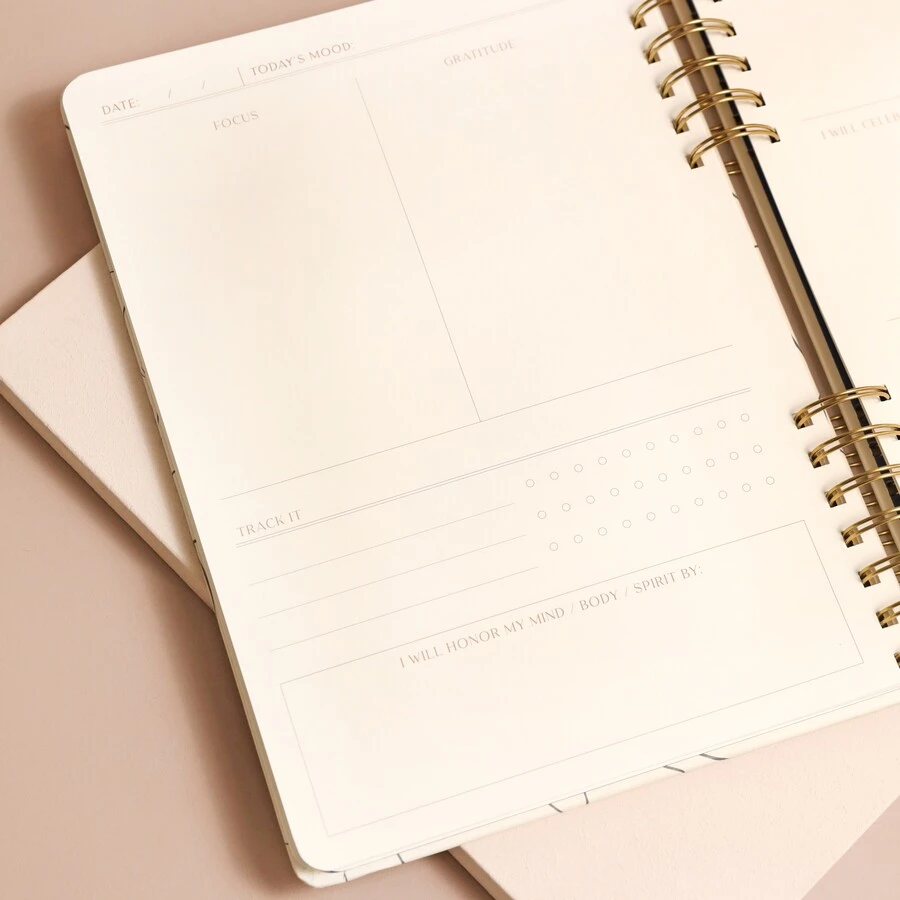 This notebook features a sticker page alongside a page for personal details. After this, each double-page spread includes a place for your focus, gratitude, celebrations and things to let go. There is also a place for you to track goals, as well as for your everyday thoughts. This book has a bronze-coloured elastic closure and is finished with a golden spine.