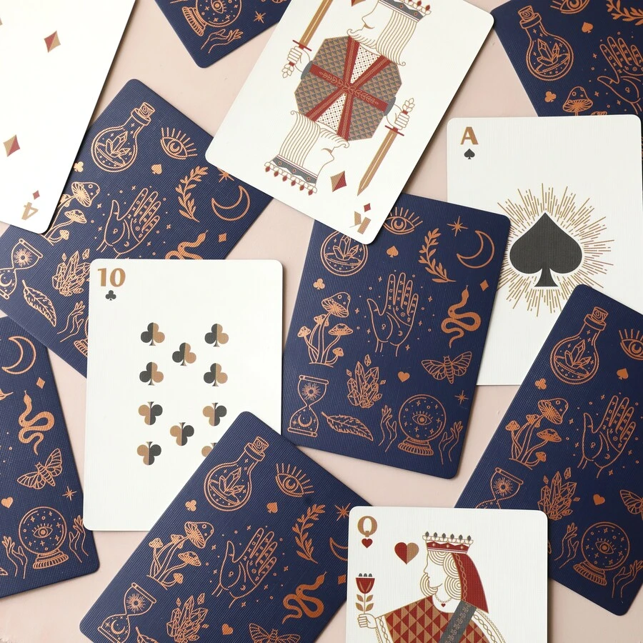 This 54-card deck includes all four suits and comes packaged in a gorgeous navy box with rose gold foil detailing. Each spiritual illustration from the box is repeated on the back of each card and includes images such as crystals, butterflies, stars, and palm readings.