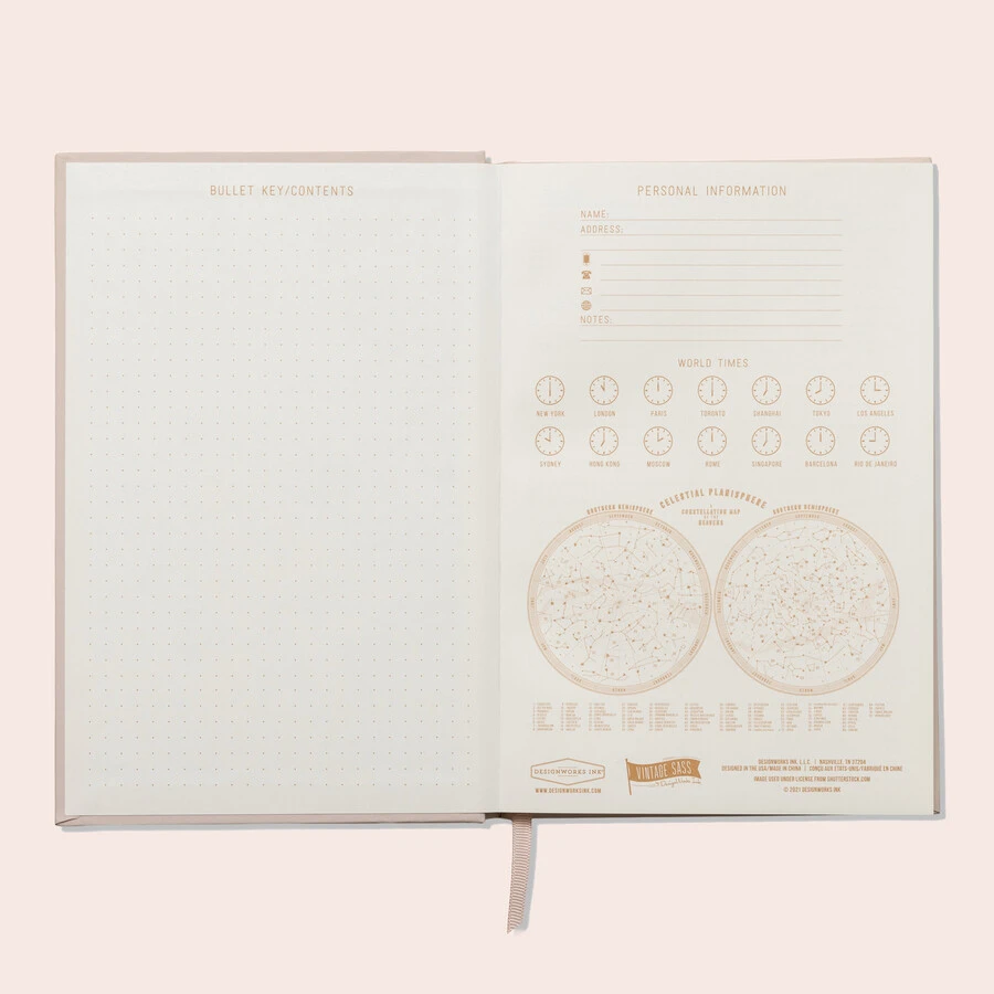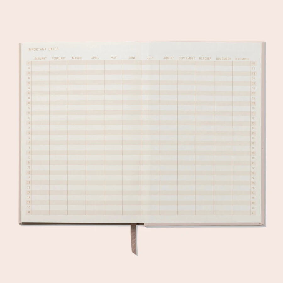 The pale yellow front cover features a gold debossed ‘what the shell’ quote overtop a gorgeous snail illustration. Inside the front cover is a bullet page for the key or contents list, with world maps and clocks, conversion charts and space for your personal information on the first page. You’ll find important dates in the year along with a double-page spread of the full year on the back three pages.