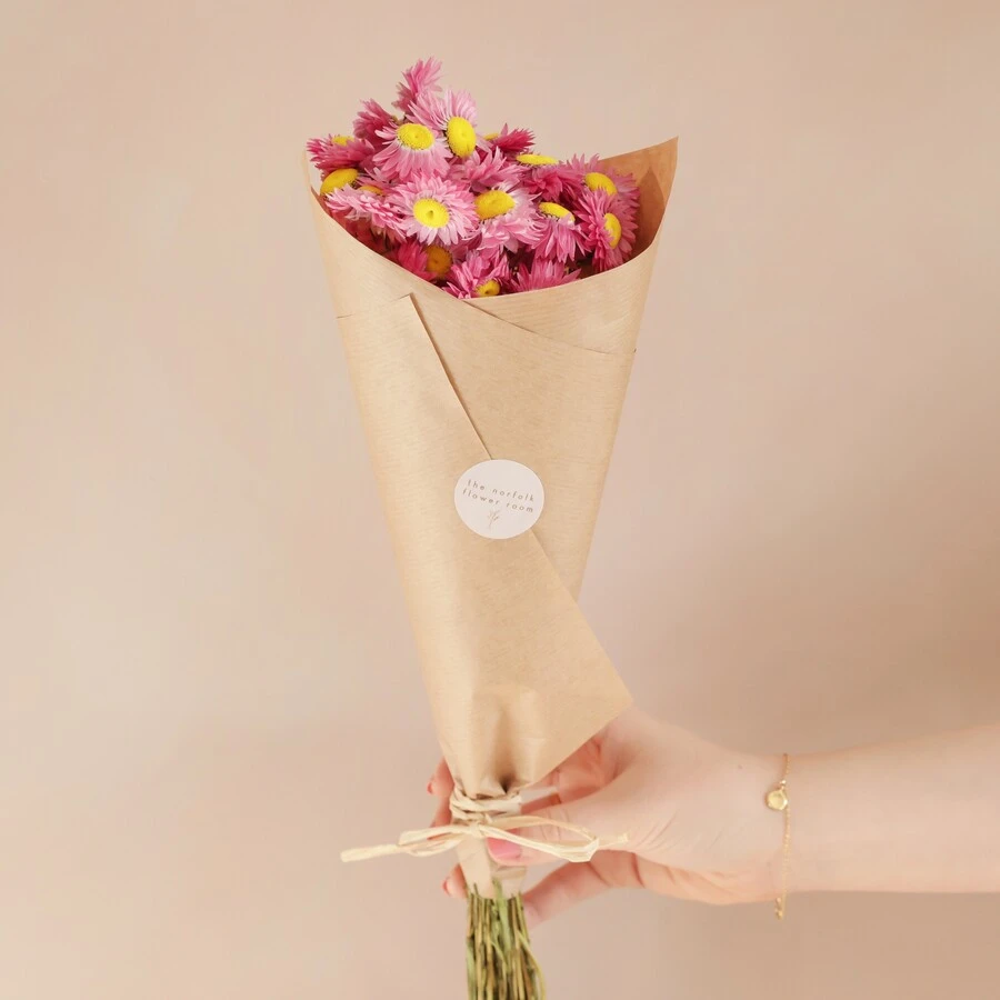A bunch of beautiful pink acroclinium daisies, expertly arranged and wrapped in paper by hand for you by our team at The Norfolk Flower Room! Send these gorgeous dried flowers to someone special or keep them as a treat to yourself and your home!