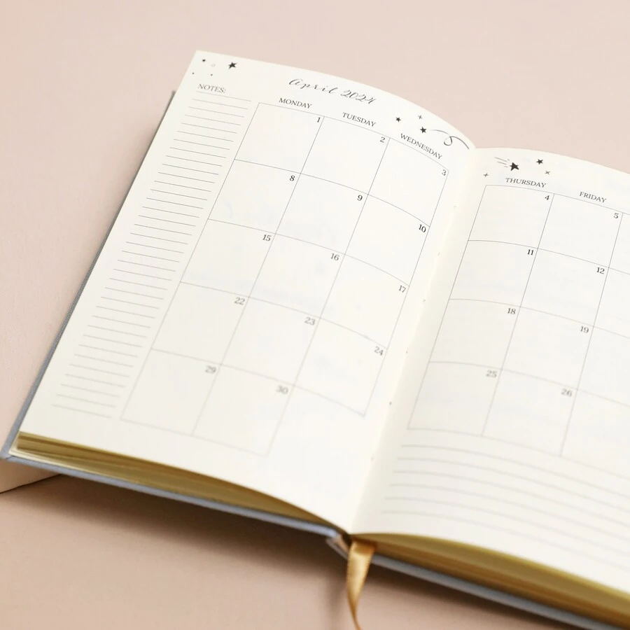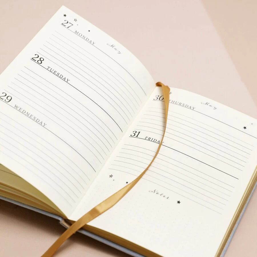 With a duck egg blue fabric cover, the front features the wording ‘twenty twenty-four’ debossed in a gold script font. The top left and bottom right corners are complete with starry detailing in a matching golden, debossed finish. The edges of the diary are lined in gold and finished with a matching gold page marker.