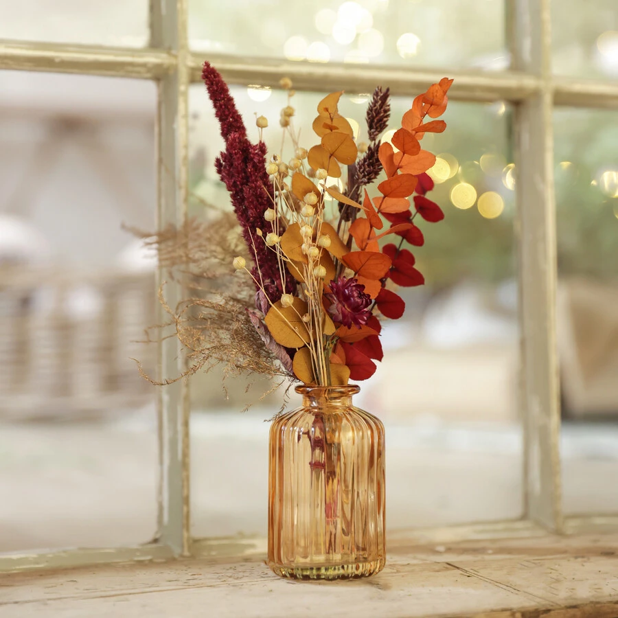 This vibrant posy boasts beautiful red, orange and pink colours all in a sleek, glass vase in a muted amber shade. This is ready to be displayed with pride and makes for great gifting. Each one is hand-selected and arranged by our expert in-house team, meaning that every posy is slightly different, making it that extra bit special!