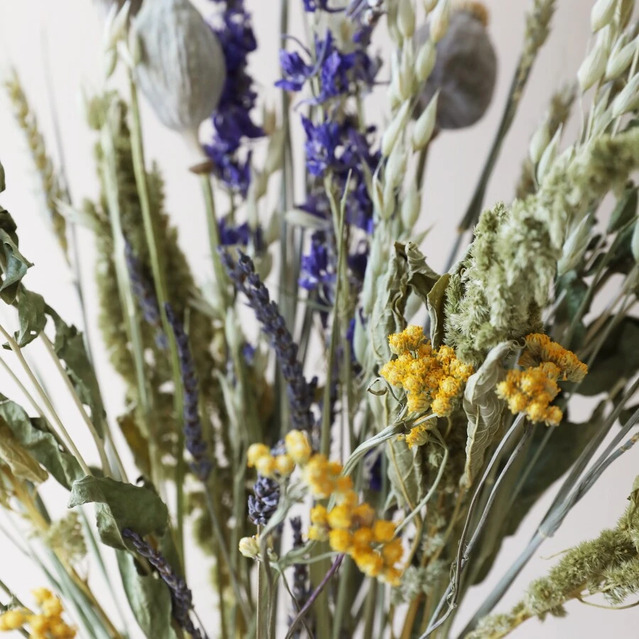 Inspired by the beautiful English countryside, this dried flower bouquet is perfect for adding subtle colour to your home! With shades of blue and yellow mixed with neutral tones, it’s great for creating a floral display in your living space.