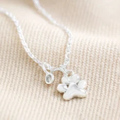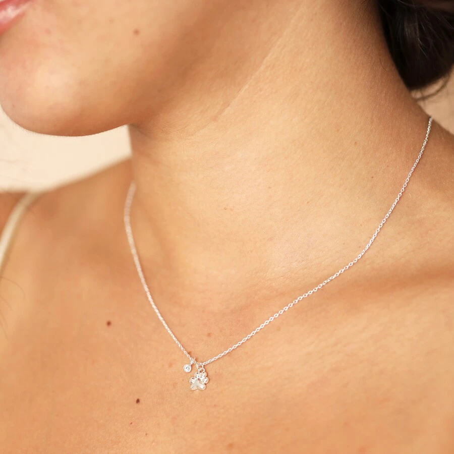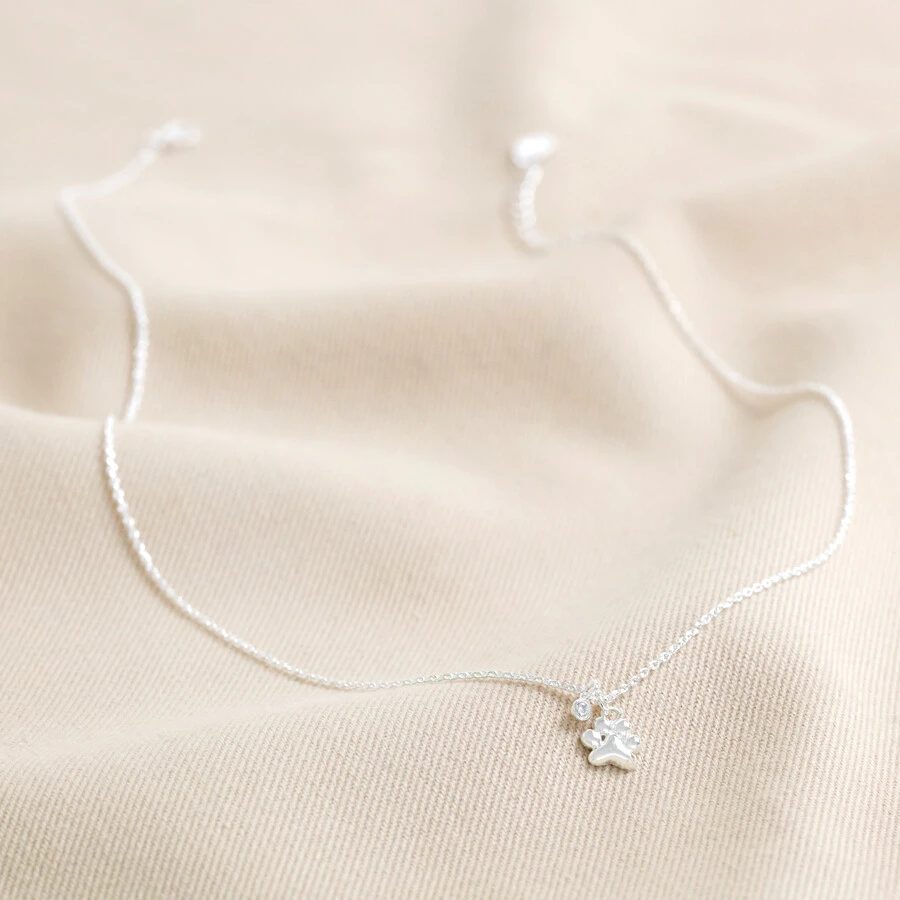 This sweet pendant necklace from Estella Bartlett features a tiny paw print pendant and a miniature crystal, both sitting on a delicate trace chain, all made of silver plated brass for a polished look.