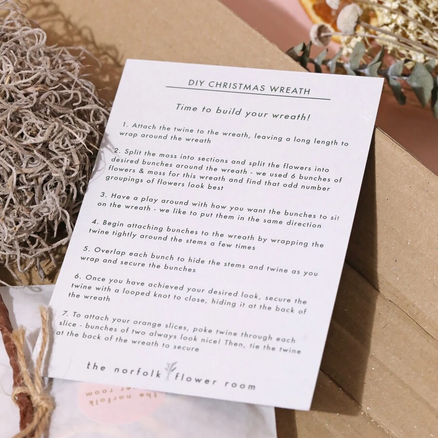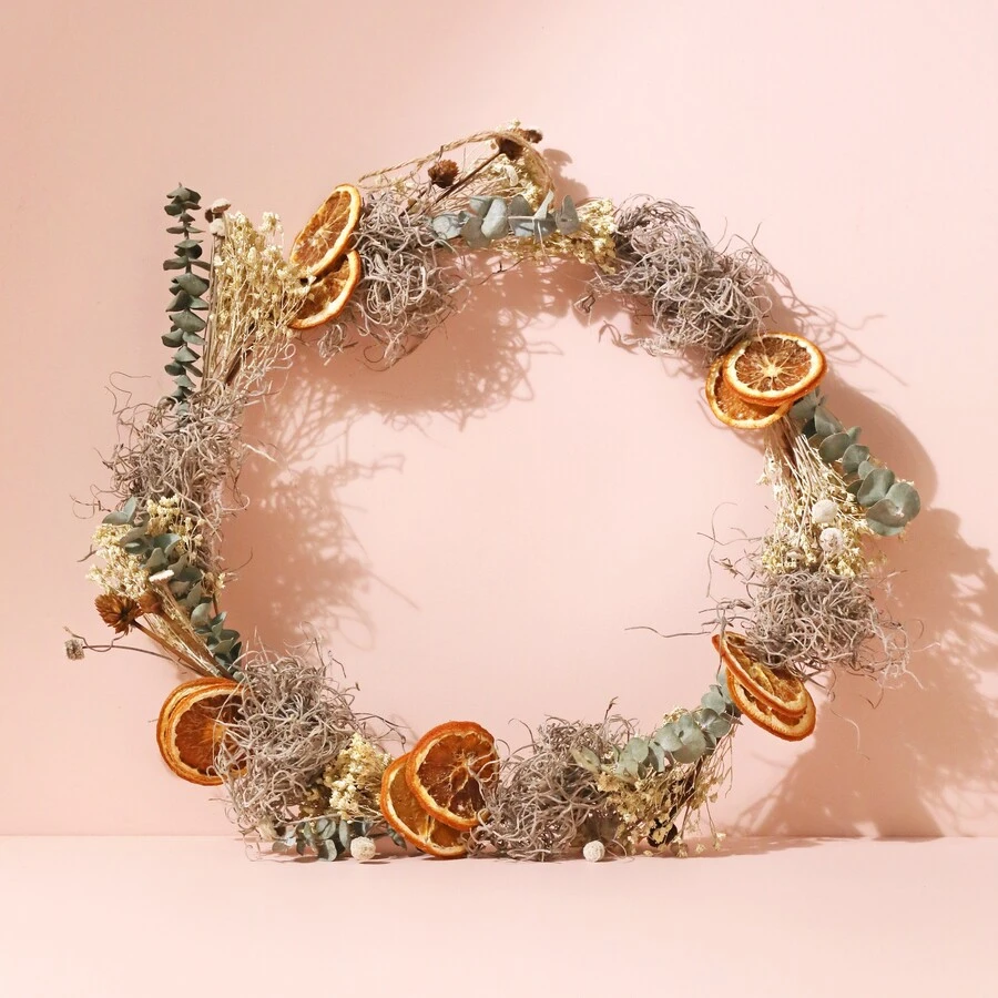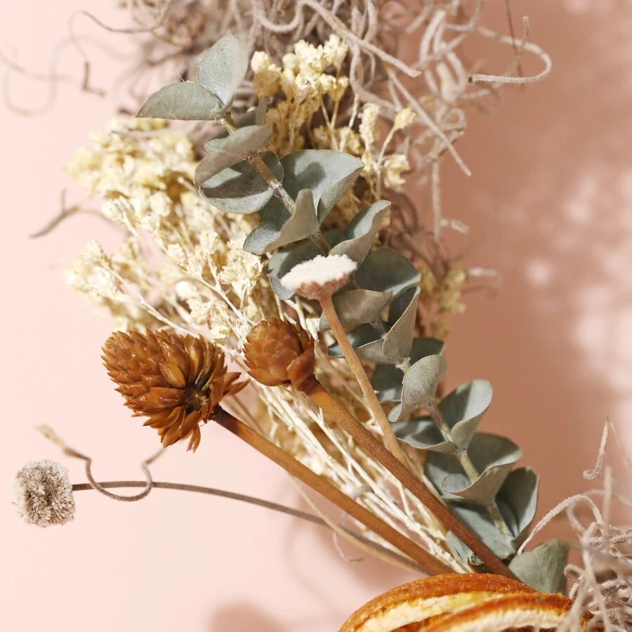 Curated in-house by our team at The Norfolk Flower Room, this dried flower wreath comes deconstructed so you can enjoy the process of creating a homeware piece unique to you. Included in this set is a wrapped base, a bunch of dried moss, eucalyptus, cream gypsophila, botao buttons and pimentinha as well as a handful of dried orange slices. We also include some twine to wrap your creation onto the base, in addition to string to hang your wreath for all to see!