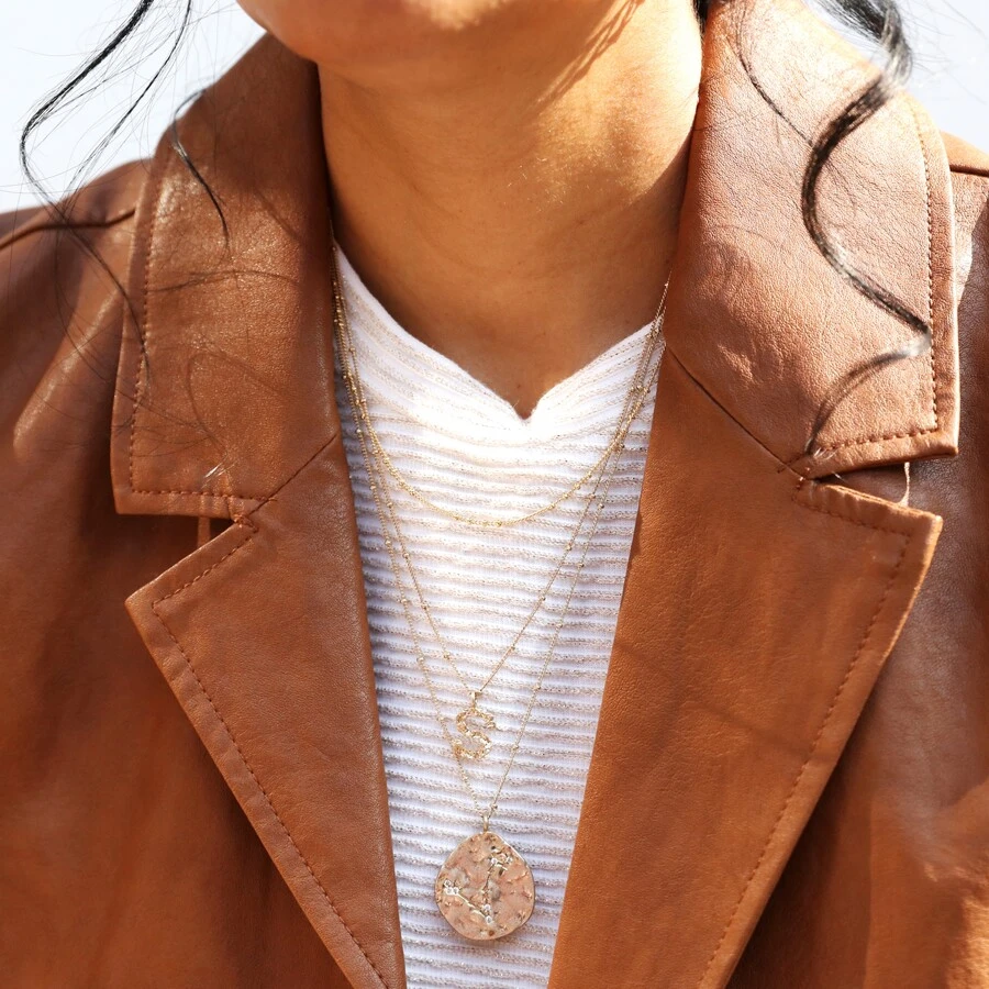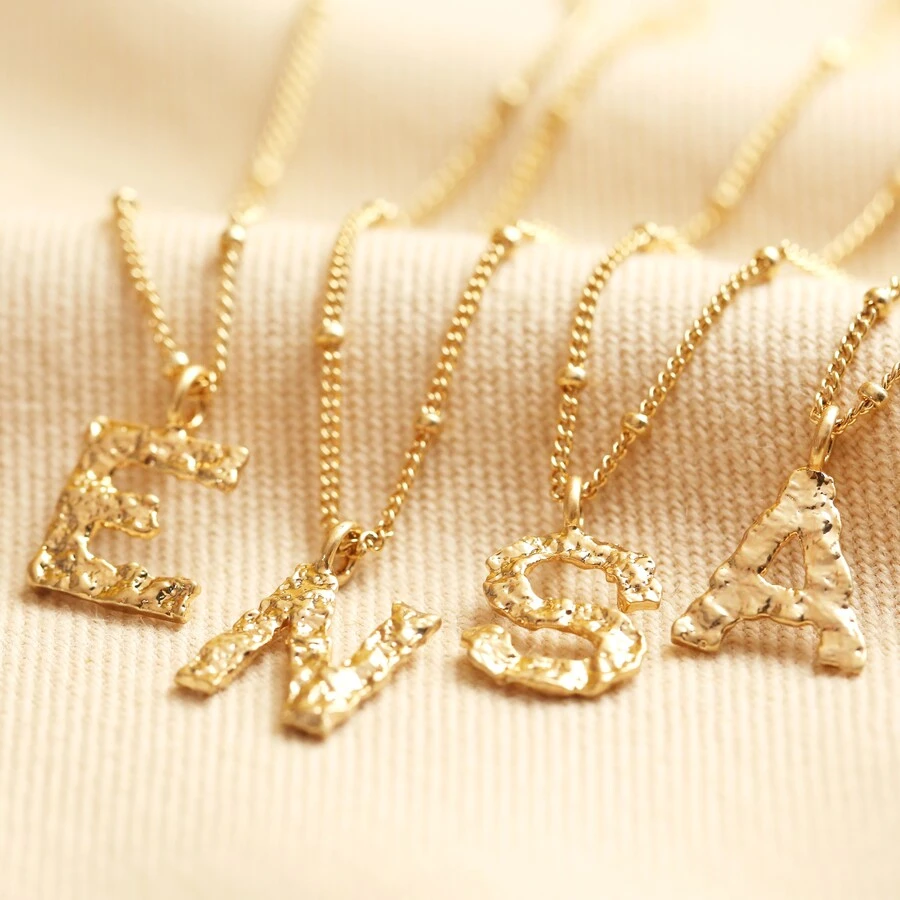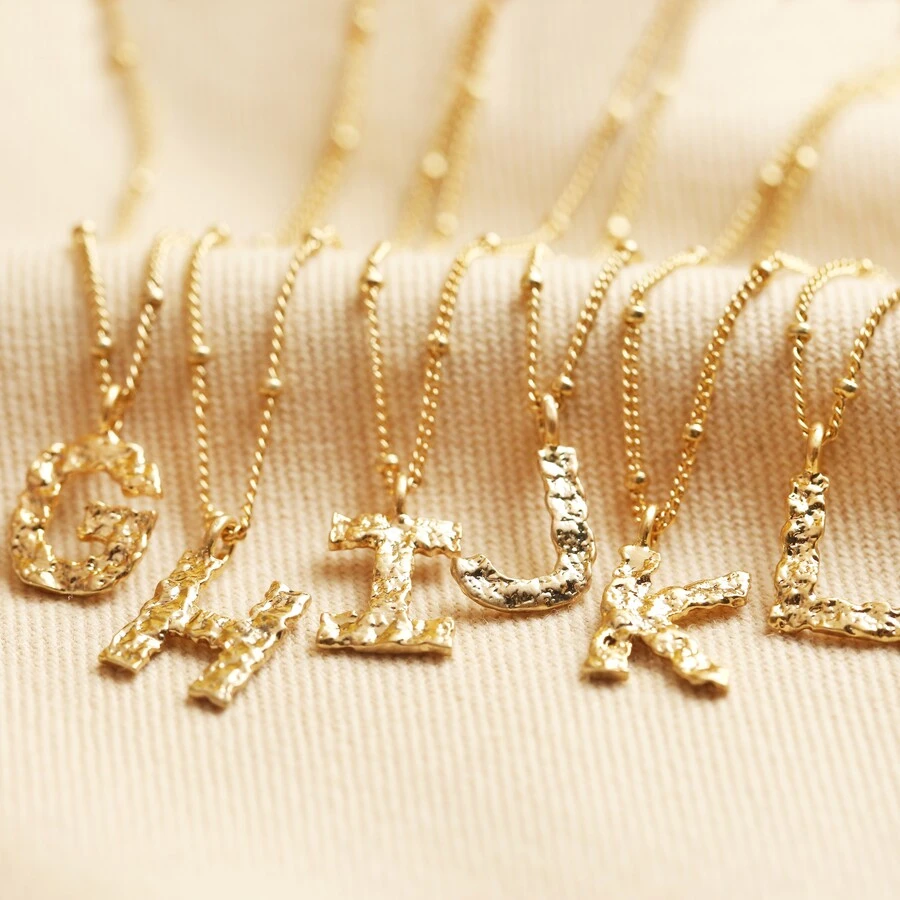 This necklace features an organic-style letter pendant suspended from a satellite chain, all in shining gold. The chain fastens via lobster clasp and extender links for simple and adjustable wearing. A fantastic piece for wearing alone or with your other favourite gold necklaces for an on-trend layered effect.
