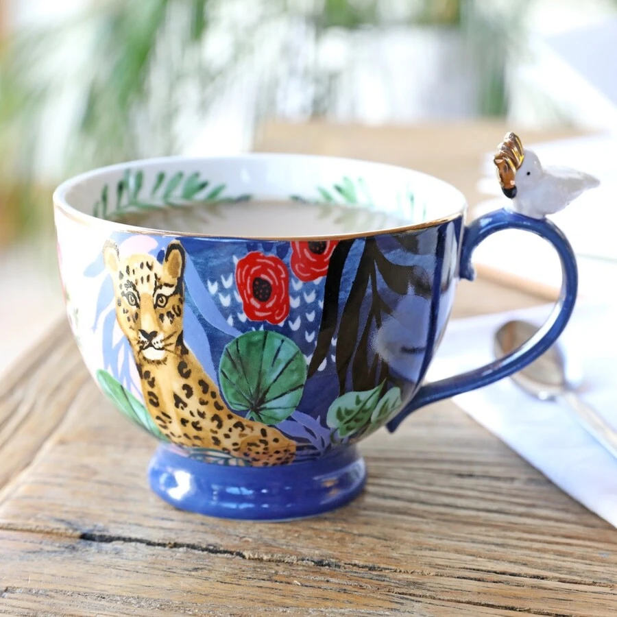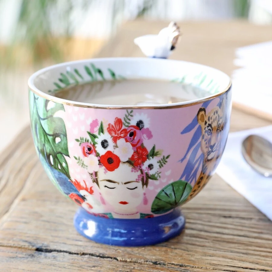 A vibrant ceramic mug to enjoy a tea or coffee, this cup features a bright and colourful Frida Kahlo tropical forest print around the outside, and a leaf print on the inside and a parrot that sits sweetly on the handle.