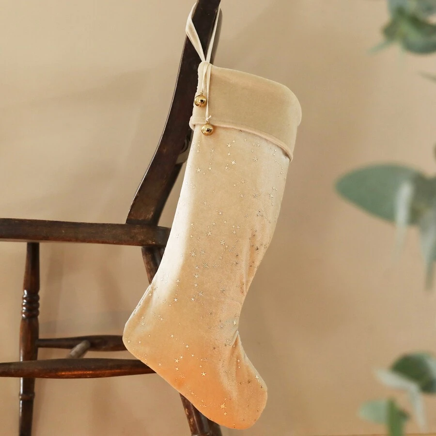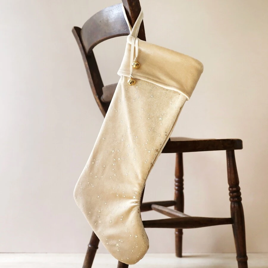 Simply hook the stocking over the end of the bed or on a mantelpiece via the loop of velvet at the top. Complete with gold star constellation details and a pair of jingling bells, this is a must-have practical decoration for your home and family this Christmas.