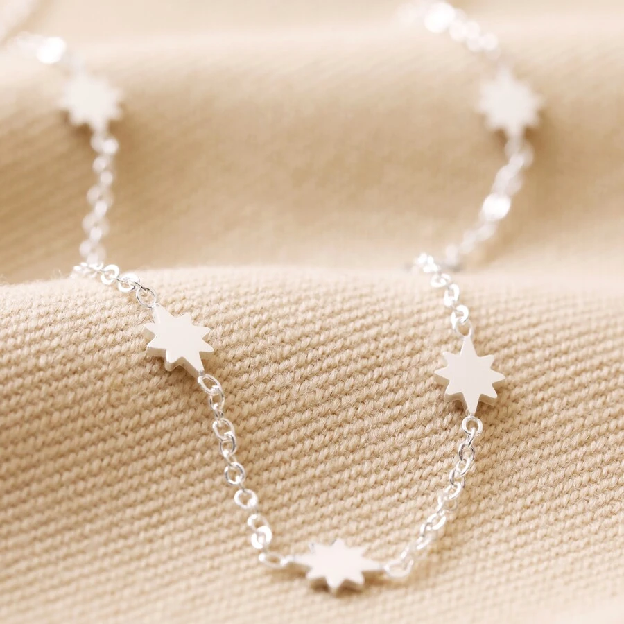 Made from sterling silver plated brass, this long trace chain necklace is studded with dainty silver stars.