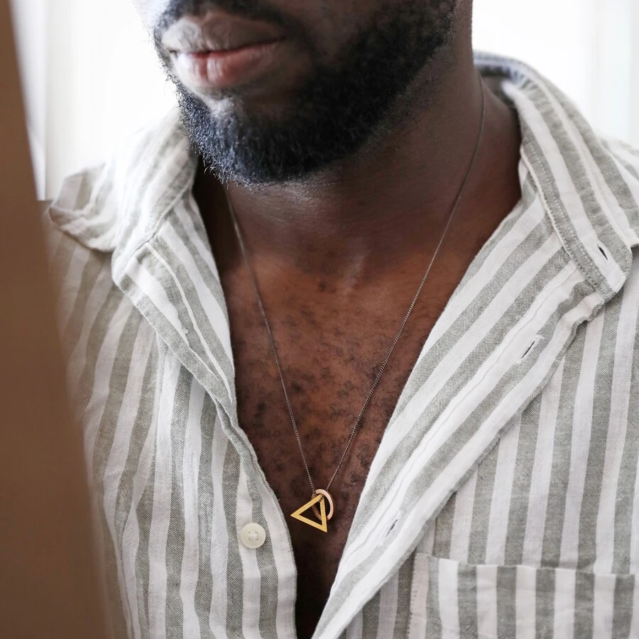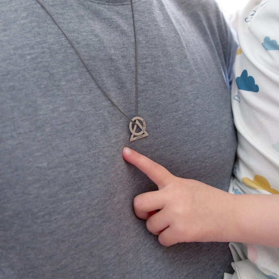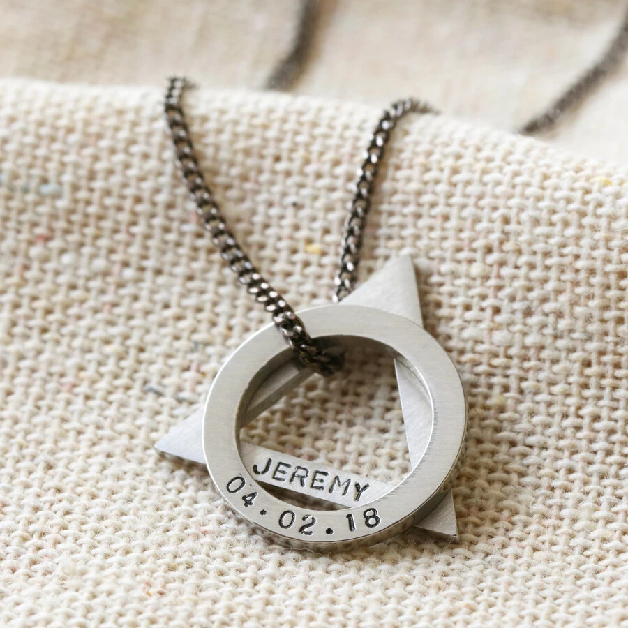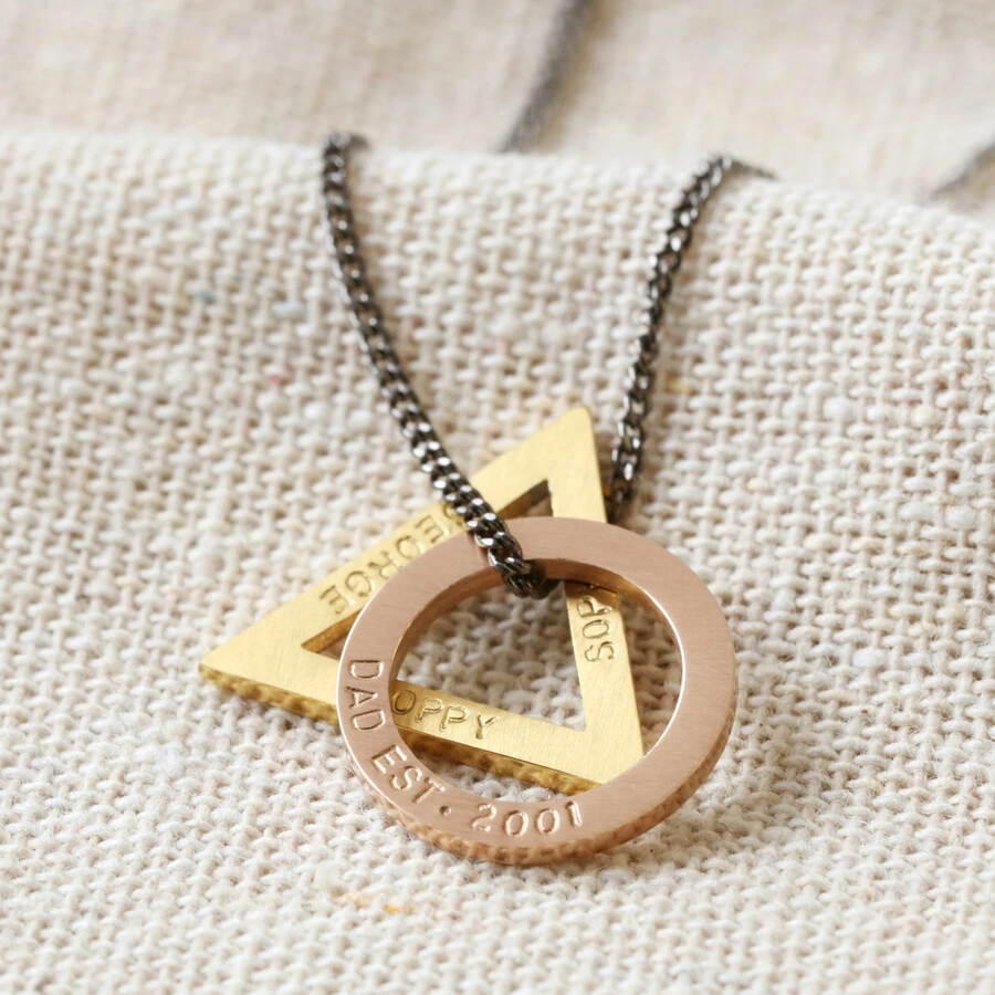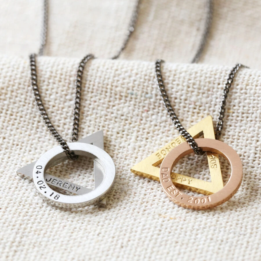 A stylish accessory for him, this handmade necklace makes the perfect sentimental gift for dad! Featuring a hoop charm and triangle charm suspended from a long blackened curb chain with a lobster clasp fastening, this handsome accessory is a must for adding extra style points to a casual look. Whether it’s his birthday, Christmas, Father’s Day, or just a special gift, this accessory is a meaningful present he’ll love. Choose 18ct gold plated, 18ct rose gold plated, or sterling silver plated stainless steel for your charms to suit your style.