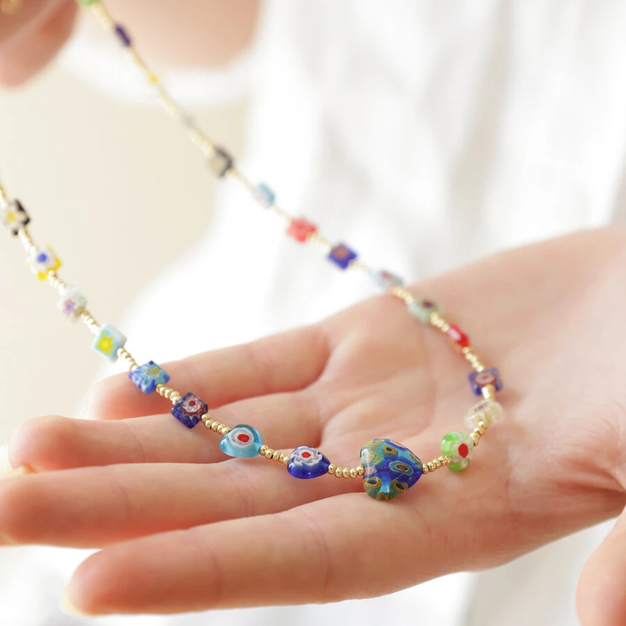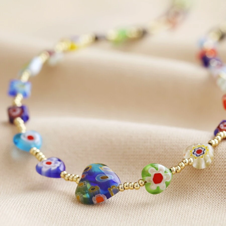 Made from 14ct gold plated brass, this gorgeous necklace is made up of a variety of millefiori glass beads in bright colours and funky patterns. The necklace features a mixture of square and heart-shaped beads, intermittently spaced with tiny gold seed beads.