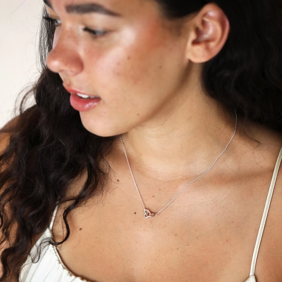 Featuring two hearts interlinked, one in silver and one in rose gold, this delicate charm comes on a polished silver trace chain. it fastens via a lobster clasp and extender link so it can be worn at one of two lengths to suit you.