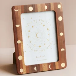 Its wooden finish and gold moon design creates a subtle and versatile piece you’ll love! This frame is perfect for housing your favourite photos in your bedroom or for gifting to a loved one who loves the stars. The back of the frame comes away by using the swivel grips that keep it in place. Your photo or print will be safe behind the clear plastic window in the 5″ x 7″ aperture.