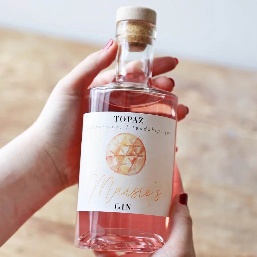 This bottle features an in-house designed label with a beautiful watercolour illustration of the birthstone of your choice, complete with positive words associated with that stone and month. To add a personal finish, our teams will add the name of your choice so it reads (name)’s gin, creating the perfect unique gift.