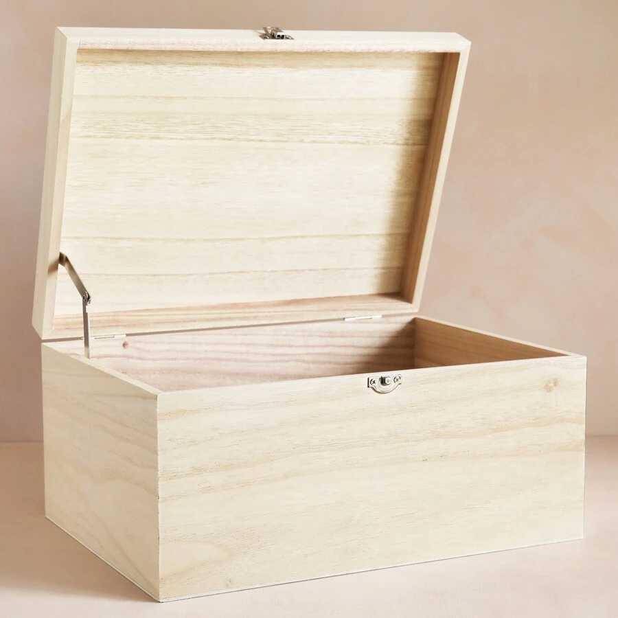 This large wooden hamper box features two hinges on the back, allowing the lid to be lifted with ease. At the front of the box is a fastening to keep the lid closed and the goodies inside safely tucked away.