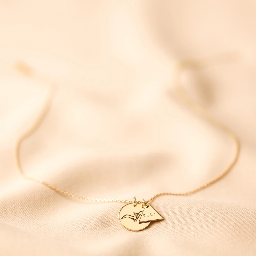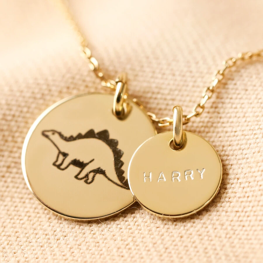 Cute and quirky, this dinosaur disc pendant necklace makes the perfect fun piece of jewellery for all dinosaur lovers. Featuring a disc charm laser engraved with your choice of one of our in-house designed dinosaurs, suspended from a delicate trace chain and finished with a small charm hand-stamped with your personalisation. This customisable necklace makes a super sweet jewellery gift for a friend who goes crazy over dinosaurs, or a child with a growing passion for the prehistoric.