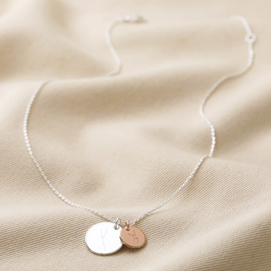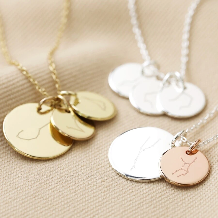 Choose your trace chain from sterling silver plated, 18ct rose gold plated, or 18ct gold plated brass to suit your style and taste. Available with either one, two, or three disc charms, you can also choose between large charms and small charms to display each special constellation. Each charm comes in a range of three metal colours, in silver, rose gold, or gold, to either match your chain, or the person that the charm represents.