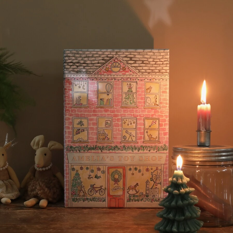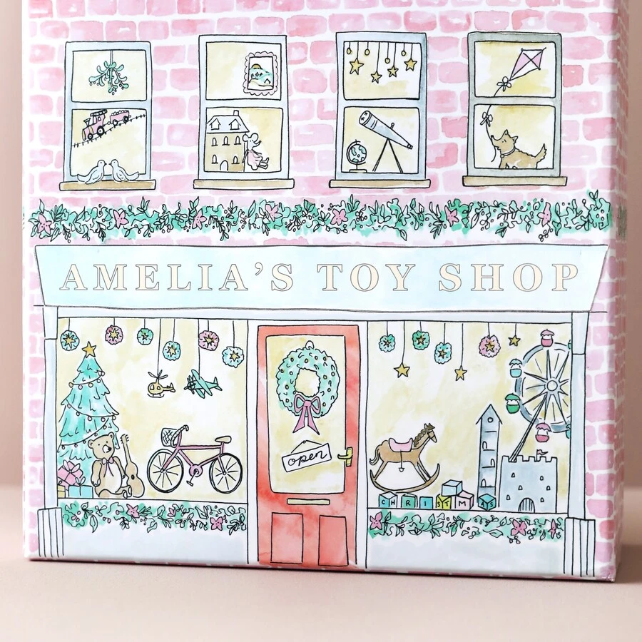 The outside of the calendar features a beautiful watercolour illustration of a traditional toy shop, with a red front door, a pretty floral awning, and glowing windows displaying treats, toys, and even a couple of Christmas trees! Our talented in-house creative teams will personalise your advent calendar by applying a ‘(name)’s toy shop’ vinyl sticker on the sign above the door, creating a special calendar, unique to them.
