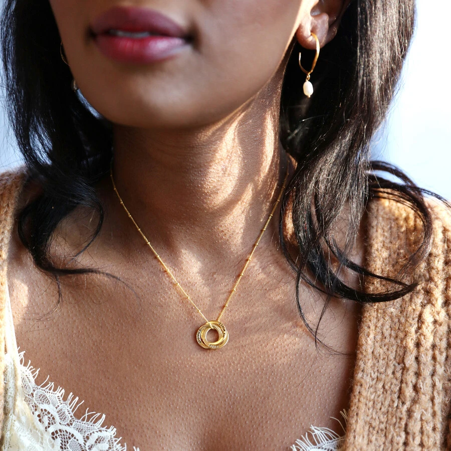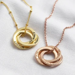 This personalised sterling silver Russian ring necklace is the perfect piece of thoughtful jewellery to give as a gift for someone special. All three of the polished rings can be hand-stamped with the wording of your choice, then suspended from a delicate chain and finished with a spring ring fastening. This stunning sterling silver necklace comes plated in 18ct gold or 18ct rose gold to suit your style preference! Give this gorgeous piece as a personalised luxury gift for her to make her feel utterly loved.