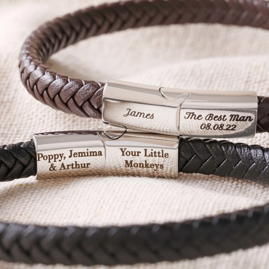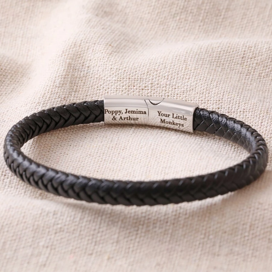 Made from black or brown vegan leather that is woven into a sturdy strap, this personalised men’s bracelet is fixed at each end to a stainless steel magnetic clasp that is engraved for him with special wording. The clasp simply slots together to wear.