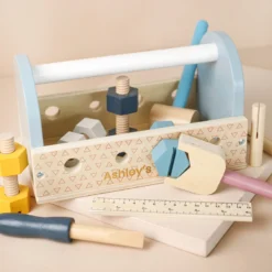 The soft blue accented tool kit holds a range of items that your child can use to play. Containing a pink spanner, a blue hammer, a navy screwdriver and a ruler, this set is complete with four multicoloured nuts with moving parts and several wooden bolts.