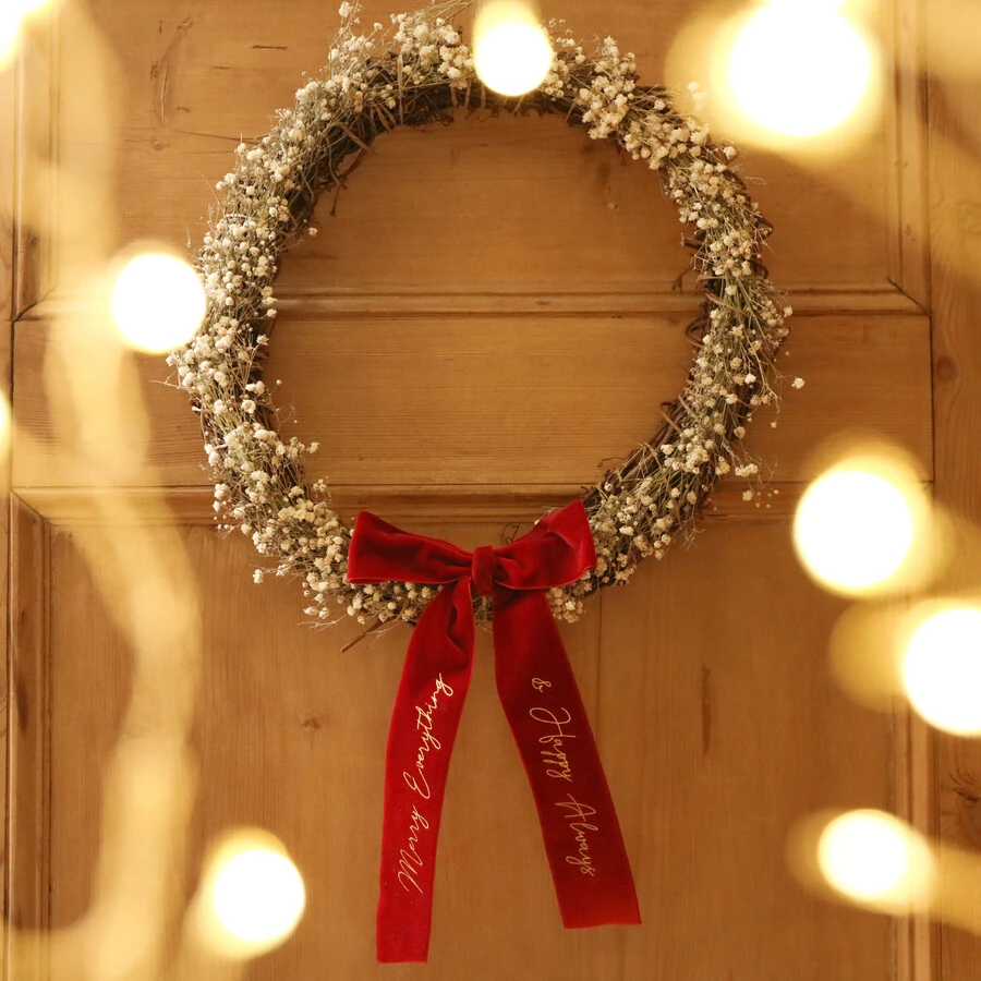 At The Norfolk Flower Room, our expert in-house team will create your wreath by weaving sprigs of dried gypsophila into a woven wood base. To finish, our personalisation team will apply your wording of choice to a red velvet bow before attaching it to the bottom of the wreath, creating a unique piece you’ll love! Hang this dried wreath on a covered front door or in a living space to admire all season long.