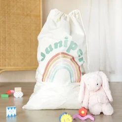 Fastening via a simple drawstring, the front of this holder is printed with an earth-toned rainbow illustration before being finished with a name of your choosing. The name will be printed in a matching ocean blue and makes the sweetest finish. Whether you use it to keep their favourite toys in one place, or you bring it out each Christmas to fill with their stocking fillers, this handy storage sack will make the cutest addition. The final touch of their name will ensure it’ll never go amiss!