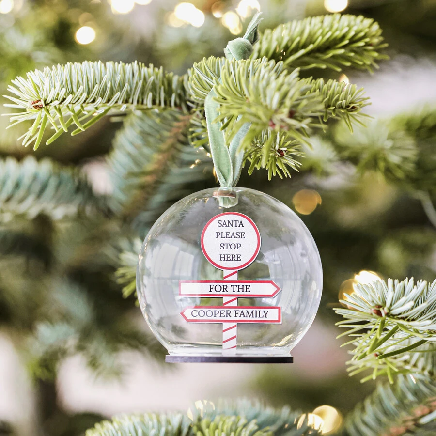 This gorgeous glass bauble features a velvet ribbon and a wooden signpost inside, cut, printed and fixed inside the bauble by our expert in-house team. The sign reads ‘Santa please stop here’ at the top, followed by your wording on the signposts below. Perfect for families with young children excited for Father Christmas to stop by, this fun hanging decoration is ready to hang pride of place on your Christmas tree to guide Santa and his gifts.