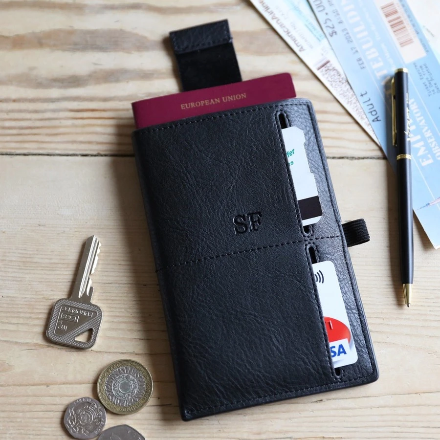 A stylish faux leather passport holder to keep your passport and travel cards safe, personalised with your initials to create a seriously special gift. Simply slip what you need into the various slots in the personalised sleeve and feel safe in the knowledge that your things are securely kept together. Our in-house team will carefully deboss your passport sleeve with the two initials of your choice, transforming it into something unique.