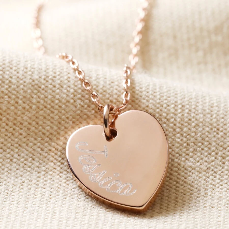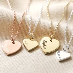 A heart charm of your plating choice and size engraved or hand-stamped with the name/s of your choice. Attached to a matching chain in your preferred style and length. Choose from sterling silver, 23ct rose gold plated vermeil sterling silver, and 23ct gold plated vermeil sterling silver. Character limit: small – up to 7 characters. Large – up to 12 characters. Both limits include spaces and punctuation.