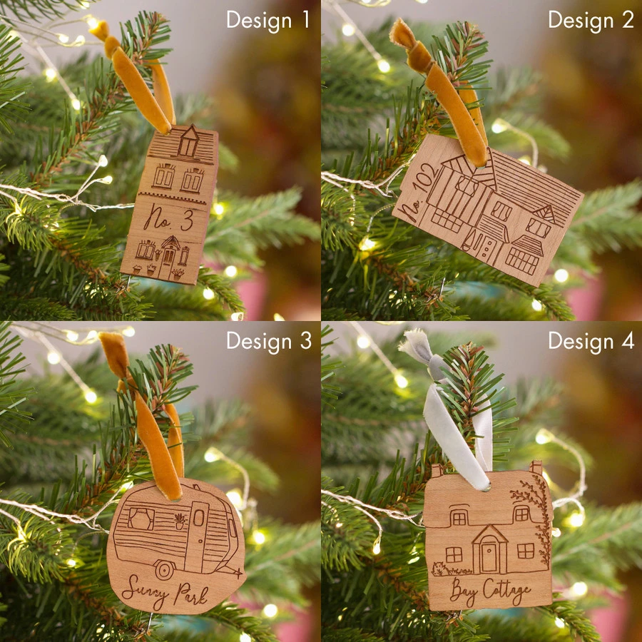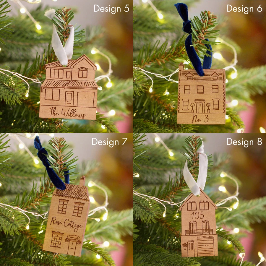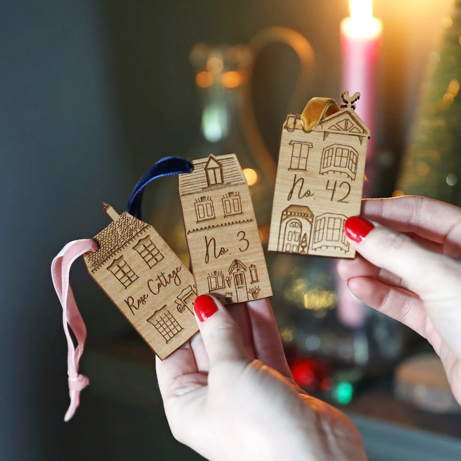 A handmade decoration to add a personal touch to your home interior, this hanging house has been designed and made by us for you to display at any time of the year. Ideal for the festive season for hanging on a Christmas tree, or finishing off a special present, this wooden decoration is laser engraved with a house design and finished with your preferred wording, whether that be a cottage name, number, or street. Each design comes with a complementing velvet ribbon in your favourite colour to hang in your home.