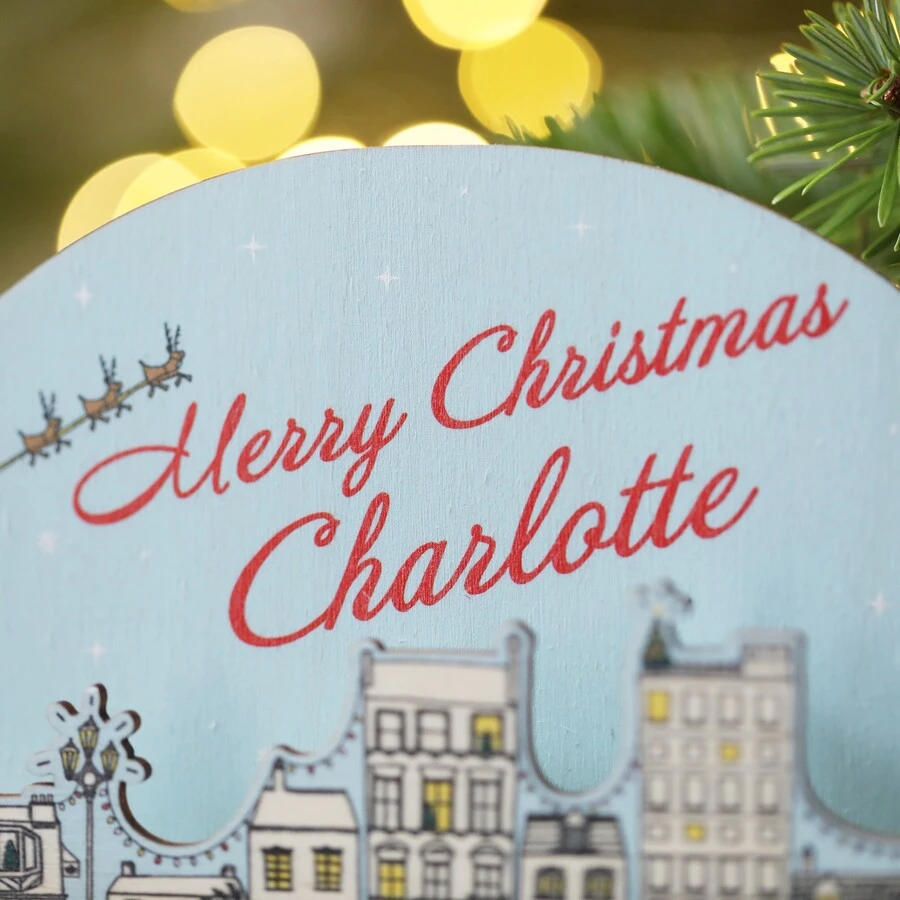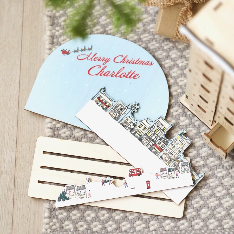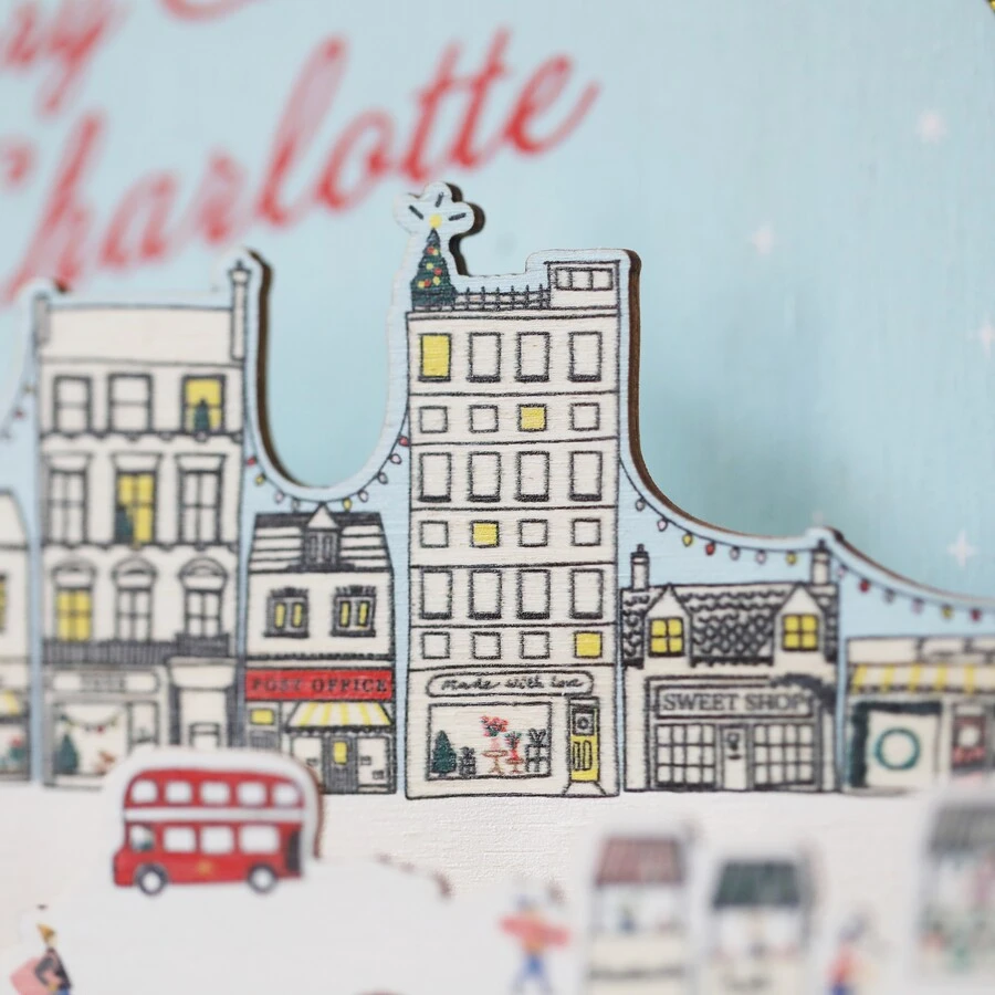 Made of wood, this traditional advent calendar comes with 24 labelled drawers for you to fill. Pop small gifts, treats and goodies in each drawer and leave a surprise for each day leading up to Christmas. This calendar is complete with a buildable wooden topper depicting a snowy market scene. With houses and a bustling market, this scene is finished with a shimmering sky (featuring Santa himself) and a personalisation of your choosing in red script font.