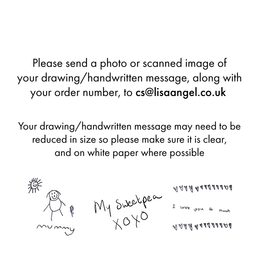 The disc decoration will be laser engraved with your supplied handwritten message. Email a picture or scanned image of the handwriting you want engraved onto the decoration, along with your order number, to [email protected], making sure that it is clear and on blank paper where possible.