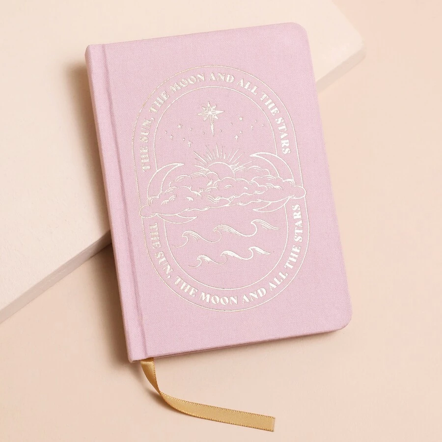 A celestial illustration depicting two crescent moons and a rising sun hidden behind clouds is debossed in gold on top of a pink fabric-bound cover. This design is surrounded by an oval border with the wording, ‘the sun, the moon and all the stars’ at the top and bottom. The edges of the pages are finished in gold and complete with a matching page marker.