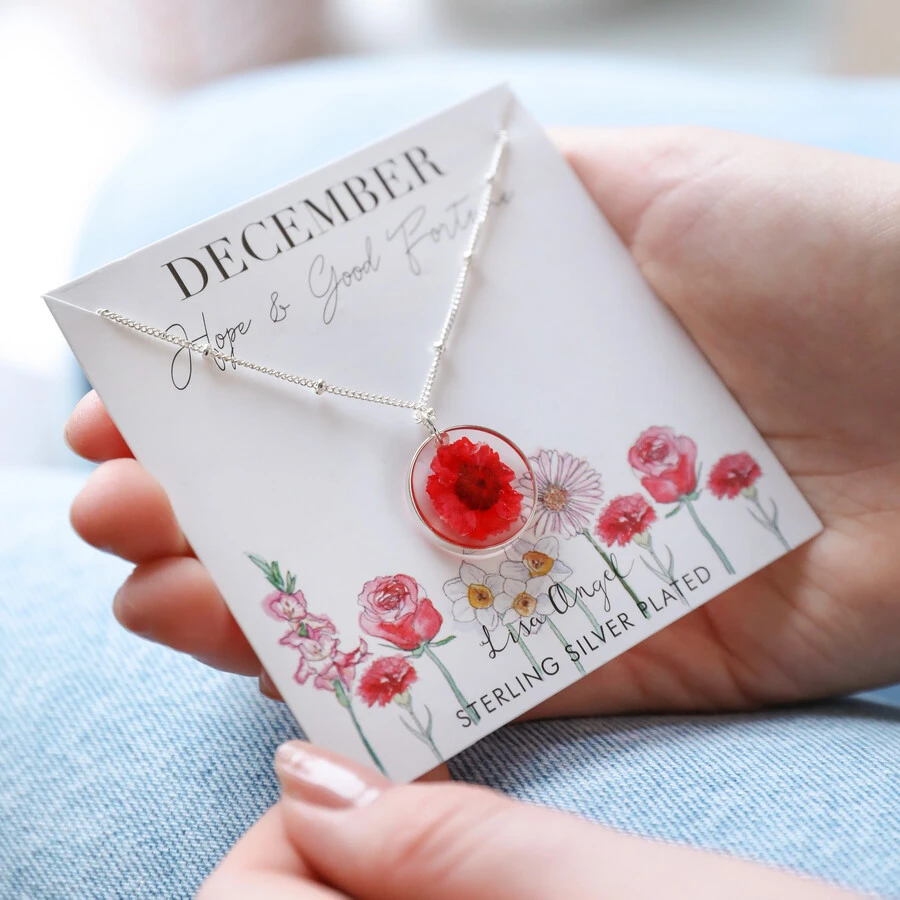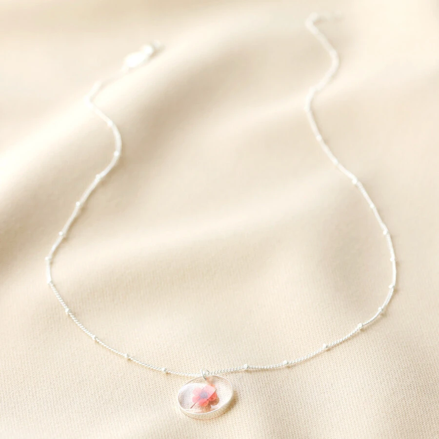 This ladies’ necklace features a resin pendant with a sterling silver plating border, and inside the resin is a real pressed flower that represents a month of the year, typically the month that the wearer was born. With twelve beautiful flower pendants to choose from, each in its own unique shape, these silver necklaces make the perfect birthday gift for her or lovely little piece for yourself!