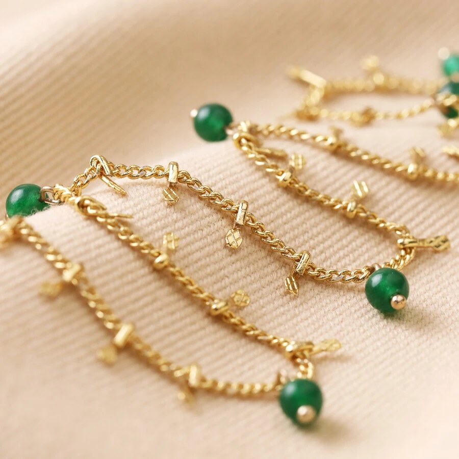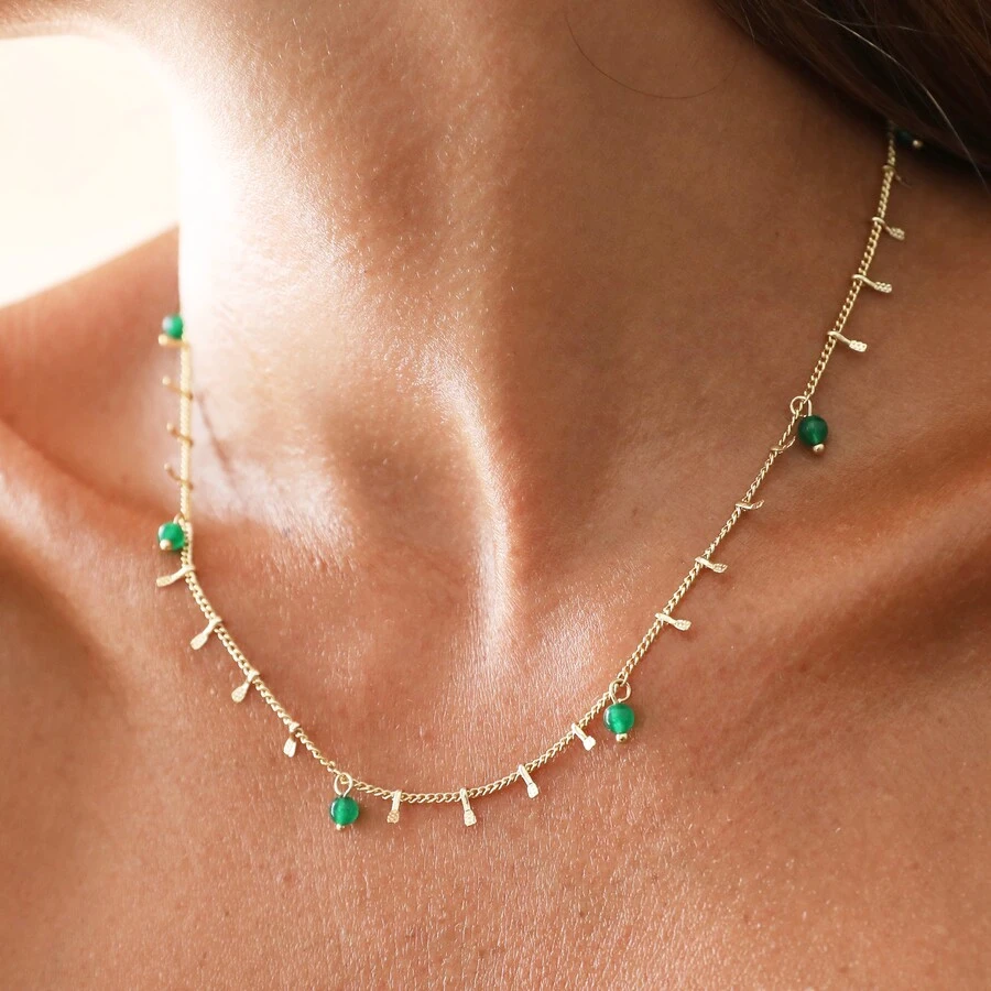 This simple gold trace chain is full of quirky detail, with unique charms running along almost the entire length of the chain. Five larger semi-precious stone beads in green sit along the chain, with two smaller green beads at each end of the charms feature. Between each bead, four tiny gold droplet charms are evenly spaced.