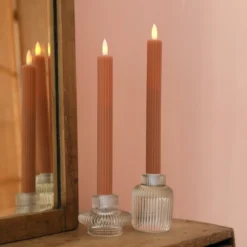 Made of wax in a nude pink shade, these tall candles have a fluted design and feature an LED flame for easy use. Turn them on to emit a warm glow wherever they are placed.