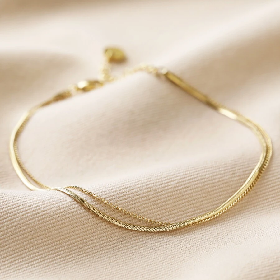 Simple and stylish, this anklet features two delicate stainless steel chains with 14ct gold plating. One chain is a fine trace chain, and the other a slightly chunkier snake chain. The anklet fastens via the simple lobster clasp, and features a short extender chain.