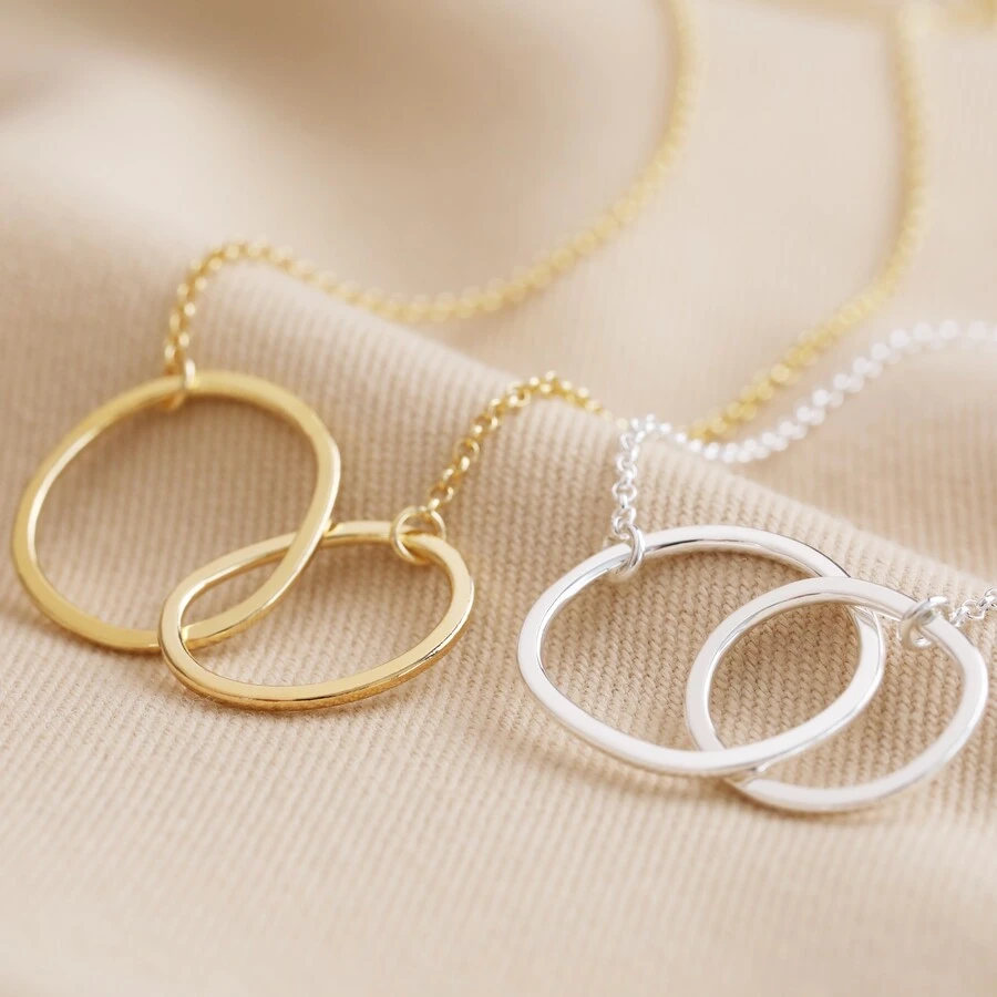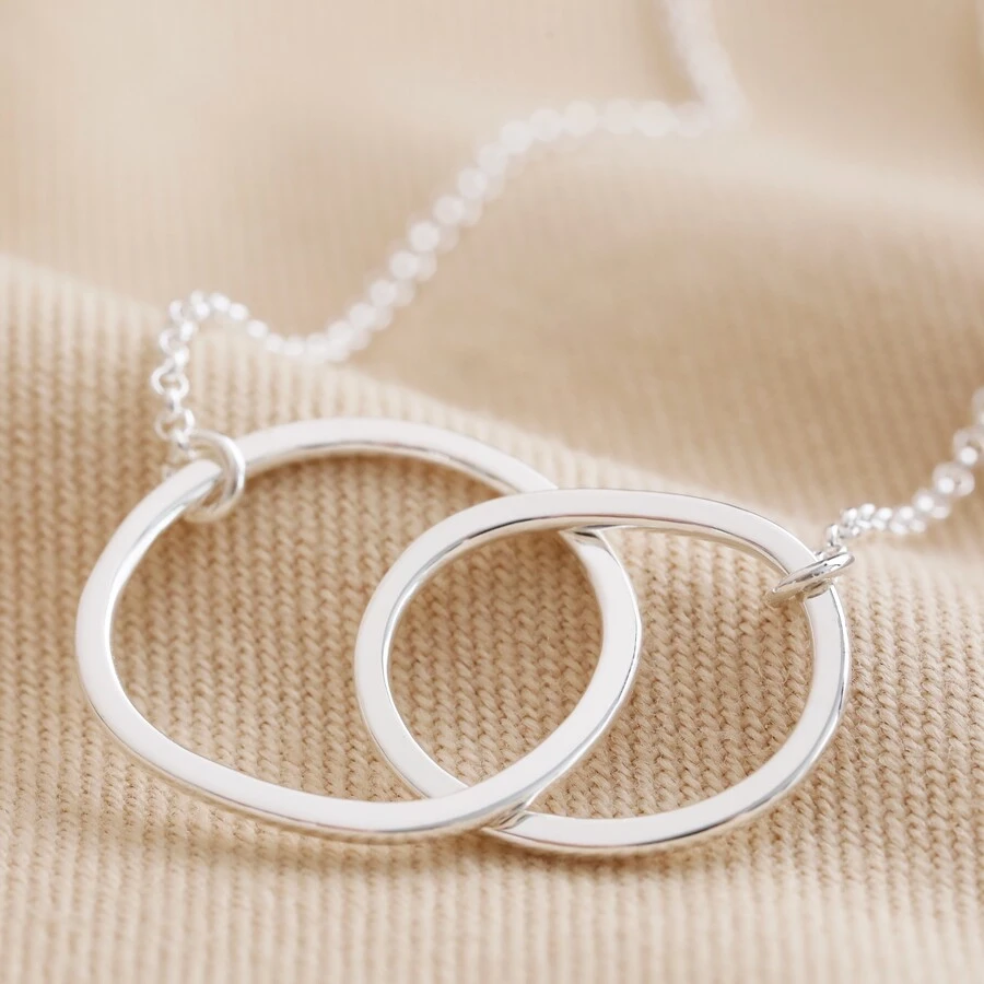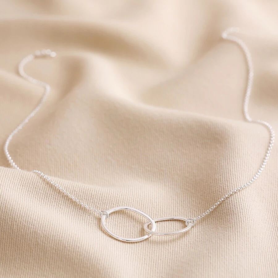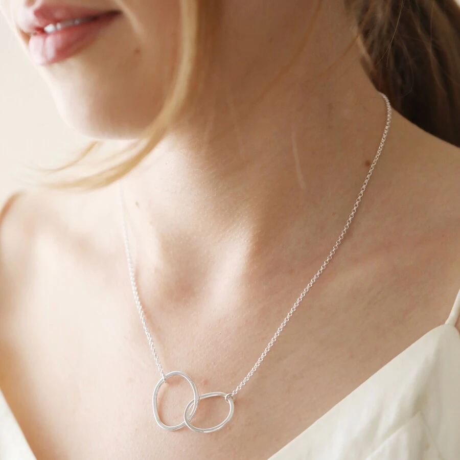 Made from hypoallergenic sterling silver, the delicate cable chain attaches to one side of each hoop, and both hoops are linked to one another in the centre. The organic, molten shape of each hoop adds a touch of quirky texture to an otherwise simple pendant, giving the perfect spin on an everyday jewellery piece. The necklace fastens simply via a spring ring clasp.