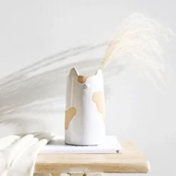 Made from natural-coloured ceramic covered in a glossy cream glaze, this sweet little kitty has neutral patches created from a clever wax-resist glazing technique. Featuring two pointy ears, a heart-shaped nose, and six sweet whiskers to the front of the vase, the back is complete with a quirky, curvy tail.