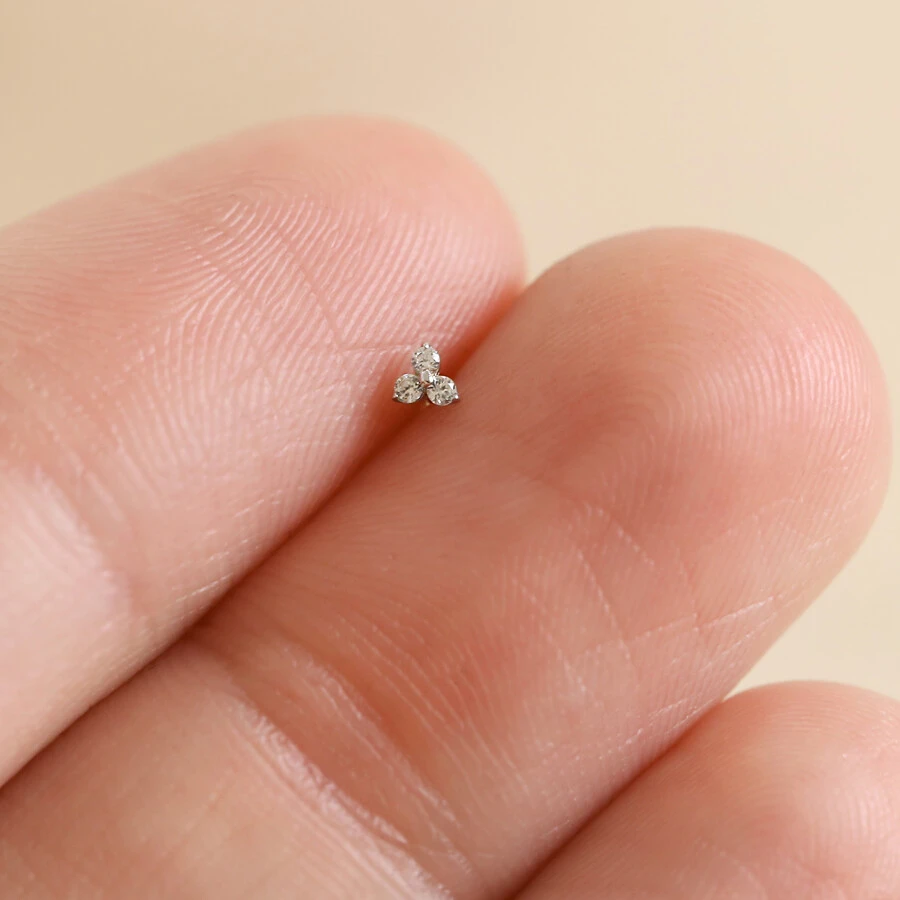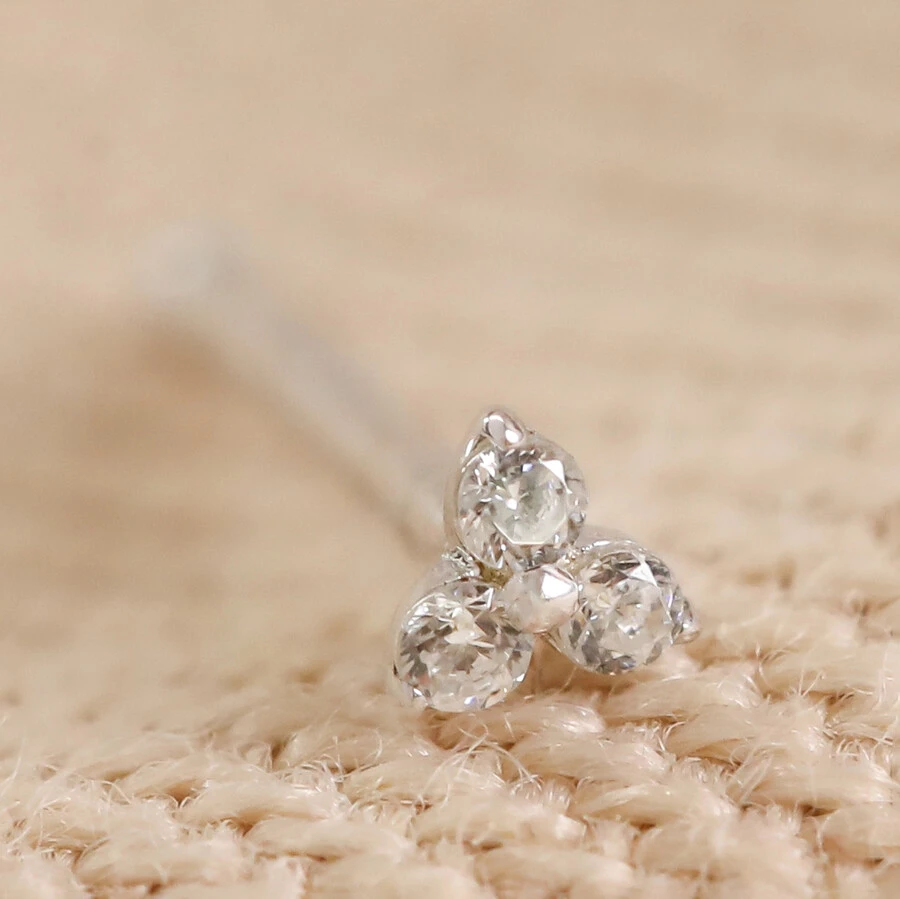Sitting on a 14ct gold post, three small crystals are held in a trinity-inspired shape. This miniature nose stud would be the perfect accessory for lovers of simple styling, or for someone who loves to change up their everyday look.