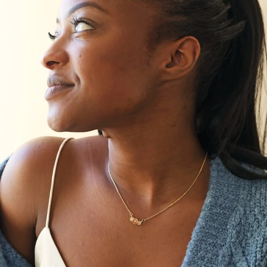 Made of 14ct gold plated brass, this pretty necklace consists of a delicate trace chain attached to either end of a row of layered flowers. The flowers each feature a detailed hammered centre and delicate petals and are infilled with coloured glossy enamel, with one peach, one pink, and one white flower. The necklace fastens simply via a lobster clasp and can be altered to any length using the ball slider.