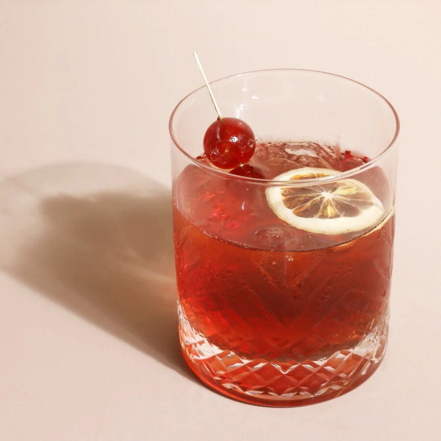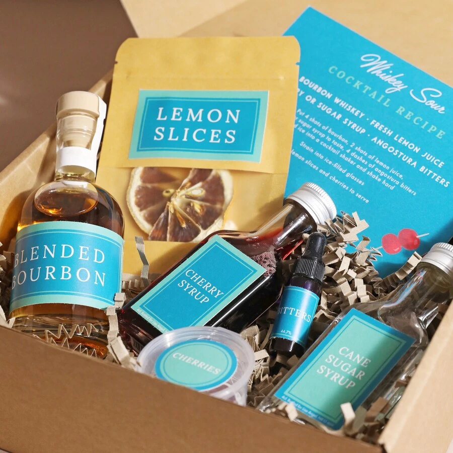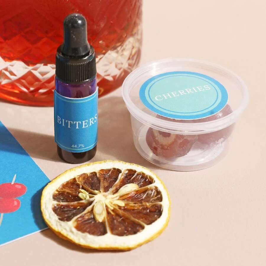 The set contains one 10cl bottle of blended bourbon, one 4cl bottle of can sugar syrup, one 4cl bottle of cherry syrup and one dropper bottle of 44.7% bitters, as well as lemon and cherries to decorate.